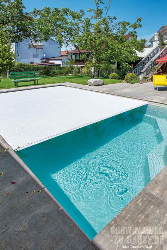 Beispielgebend ist das Objekt außerdem in puncto Automatisierung, zum Beispiel durch die Poolsteuerung von Sugar Valley. Nur etwa eine halbe Stunde pro Woche muss die Familie Jung für die Poolpflege investieren. Die Eigentümer können sich zudem über eine kinderleichte Bedienung freuen. Selbstverständlich spielt das Thema Energieeffizienz ebenfalls eine wichtige Rolle. Es wurde eine Hinterfüllung mit Isolierbeton angebracht und zudem ein ein Cover installiert. So schonen Thomas und Birgit Jung die Umwelt und sparen gleichzeitig Geld, Energie und chemische Reinigungsmittel. Der Unterflurrollladen von T&A verschwindet bei geöffnetem Becken elegant unter der Wasseroberfläche. Es entsteht eine Sitzbank, die mit den gleichen Dolomitplatten ausgestattet ist wie die restliche Poolanlage und sich optisch perfekt einfügt.