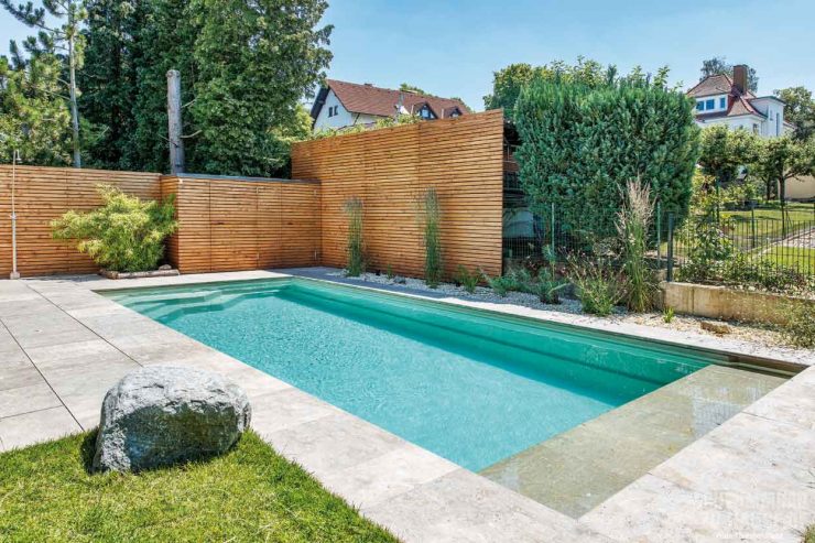 Die professionelle und sorgfältige Planung durch Schwimmbadbauer und Architektin führte dazu, dass die Bauphase reibungslos verlief und die Ansprüche der Bauherren vollauf erfüllt wurden. Um dem Wunsch nach sportlicher Betätigung nachzukommen, wurde eine starke Gegenstromanlage von Fluvo eingebaut. Auch der Anspruch, das Becken optimal in den geschmackvollen Garten zu integrieren, ist gelungen. Hochwertige Dolomitplatten schmücken den Poolbereich und machen das Schwimmbecken zu einem edlen und modernen Blickfang. Zudem ist ein beeindruckender Kontrast zu dem Wohnhaus mit efeuumranktem Geländer und traditioneller Treppe entstanden. Die Pooltechnik wurde hinter einer stilvollen Sichtschutzwand aus hellem Holz untergebracht – sodass ein weiteres optisches Highlight entstanden ist. Entspannte Stunden und laue Sommernächte kann die Familie nun auf einem Gartenbett verbringen, das mit einer Verkleidung aus Holz und einer gelben Auflage perfekt in die freundliche Umgebung passt. Diese vielfältigen Elemente stillen den Wunsch nach Entspannung ebenso wie sportlichen Ehrgeiz – jeder kommt so auf seine Kosten und kann es sich wie im Urlaub je nach Lust und Laune gut gehen lassen.