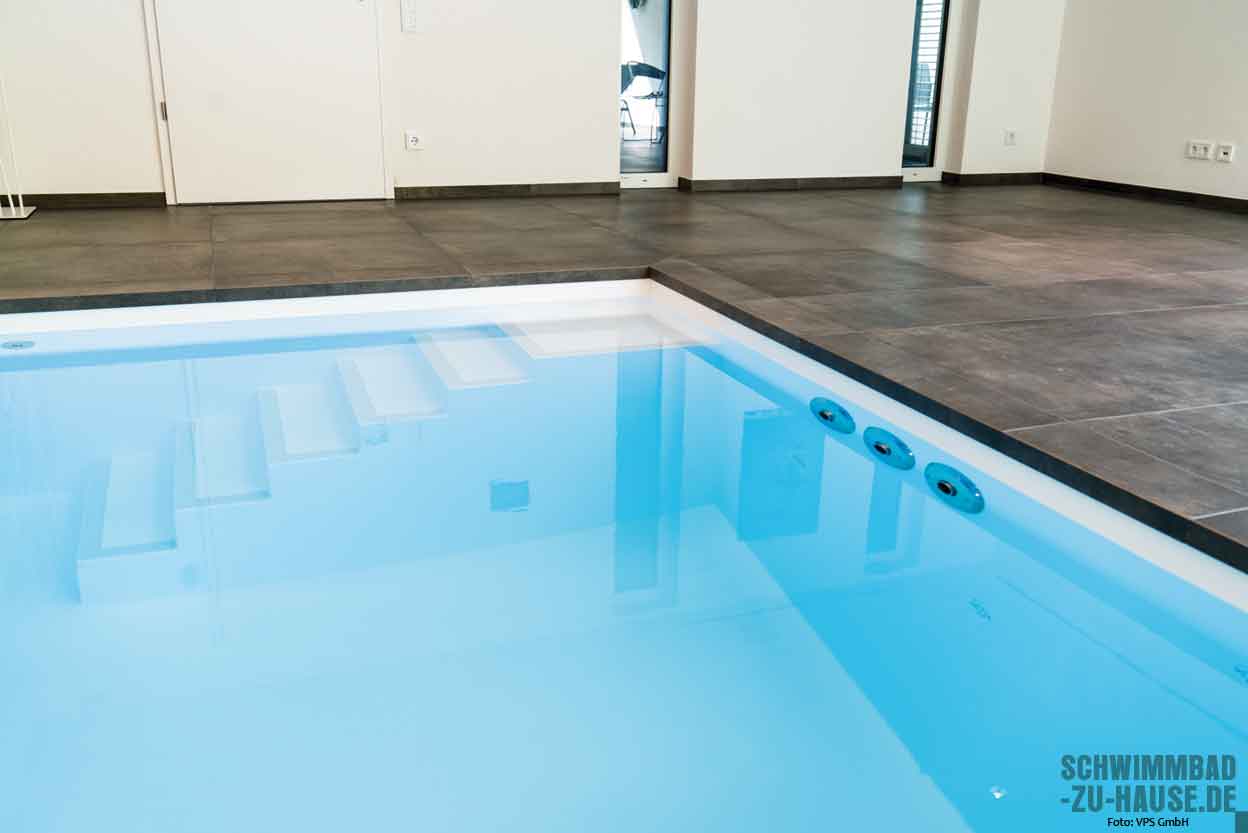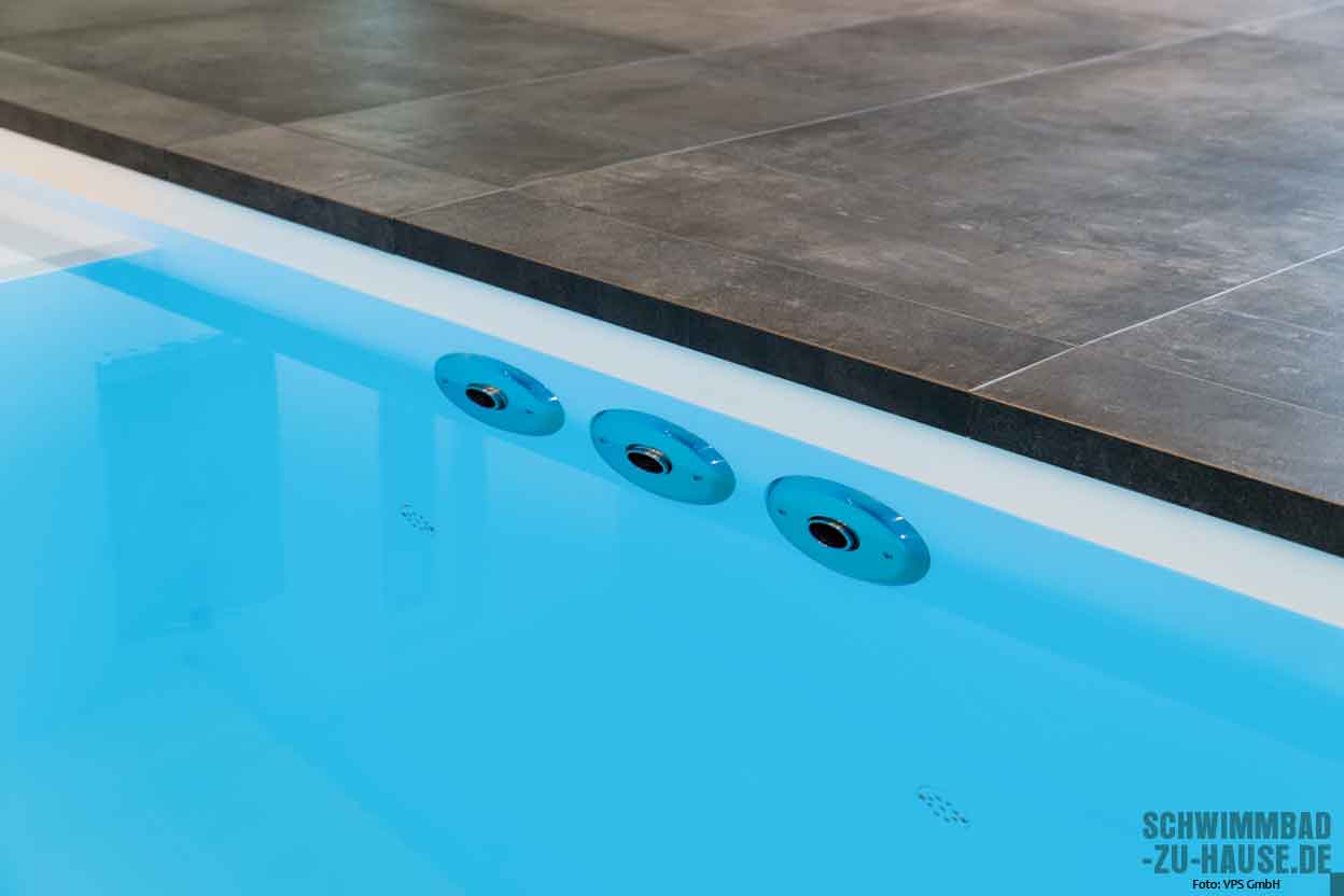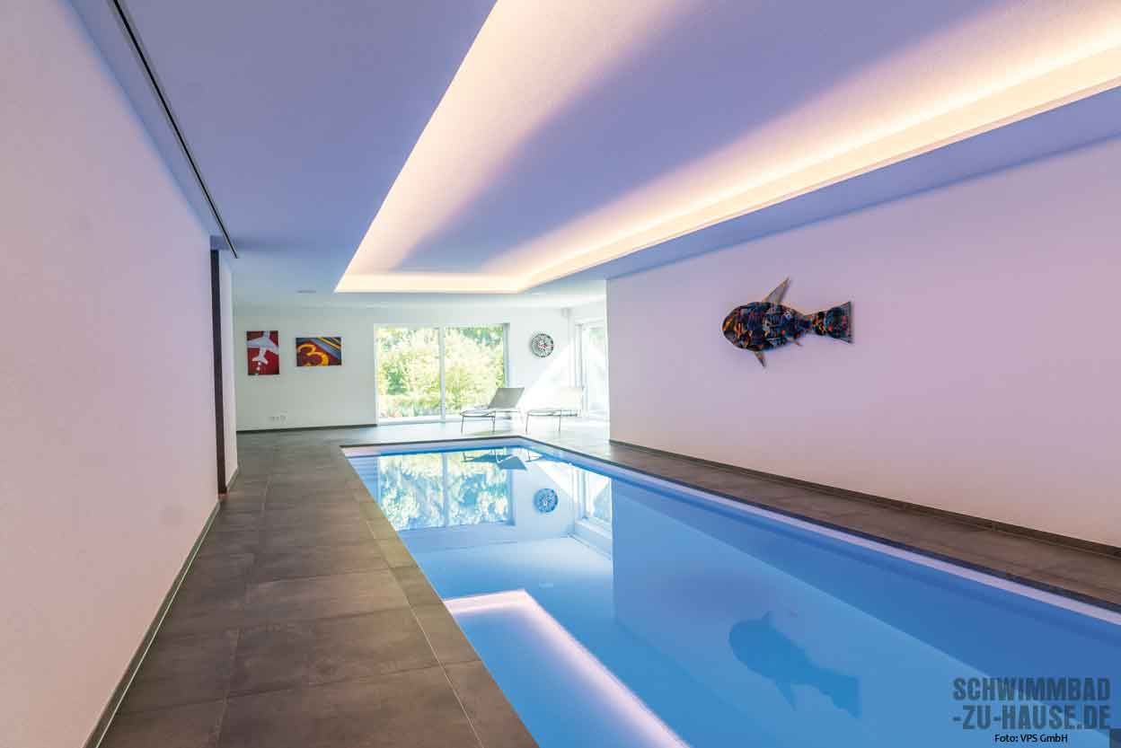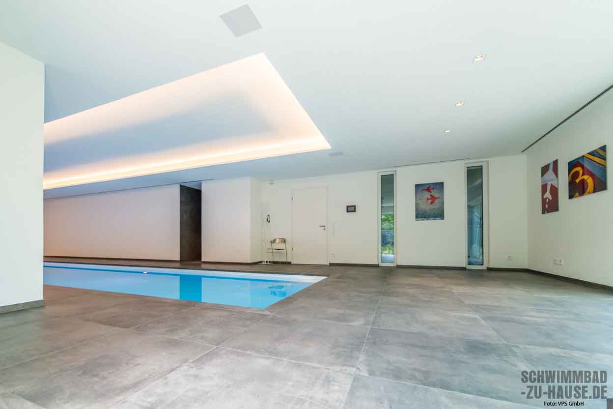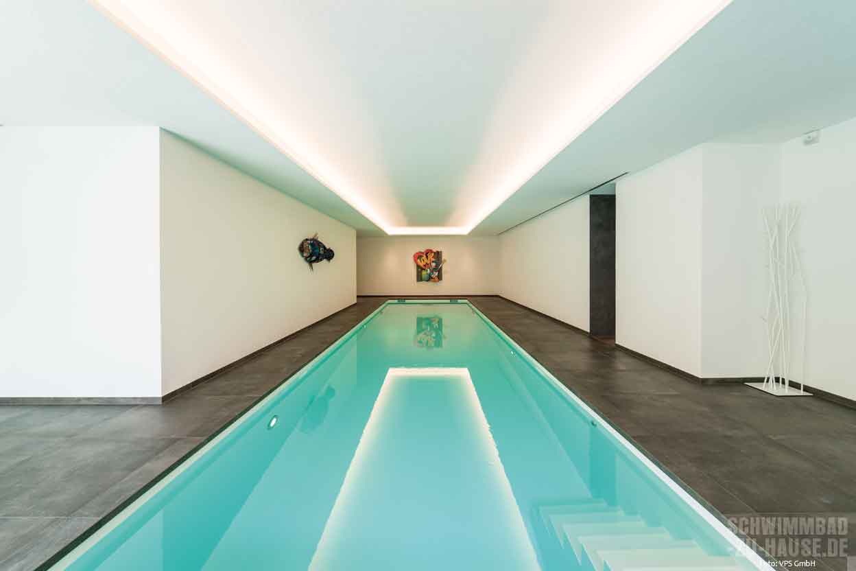 Farblich veränderbare RGB-Unterwasserleuchten und die indirekte Beleuchtung an der Decke setzen zudem interessante Lichtakzente. In dem ansonsten eher puristischen Ambiente werden die wenigen modernen Gestaltungselemente an den Wänden zum echten Hingucker. Insgesamt wirkt die Schwimmhalle im Keller des Gebäudes modern und elegant – genau wie es sich der Bauherr vorgestellt hatte. „Die Beratung bei diesem Projekt lief Hand in Hand zwischen dem Poolhersteller VPS und dem Ospa-Schwimmbadtechniker. Da beide sehr erfahren sind, ging das Projekt reibungslos über die Bühne“, blickt der stolze Poolbesitzer zufrieden zurück.