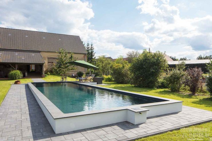 Es geht kaum besser, oder? Geht es! Dieser Meinung waren auch die Bauherren: Eine großzügige Poolanlage sollte das Anwesen mit Wohnhaus und alter ländlicher Scheune aufwerten – und die Erholung zu Hause komplettieren. Beim Stöbern in Fachmagazinen stieß man auf ein beeindruckendes Referenzobjekt der Firma Schwimmbecken Rambow aus Falkensee. Nach der direkten Kontaktaufnahme und einem ersten Gespräch mit dem erfahrenen Schwimmbadprofi und Geschäftsführer Jan Rambow war der Auftrag zur Planung und Umsetzung beschlossene Sache. Die Bauherren wünschten sich einen Pool, der die Ruhe und die Weitläufigkeit des Anwesens unterstreicht und mit einer stillen Wasseroberfläche eine ganz besondere Atmosphäre zaubert. Optisch sollte sich das neue Becken in einer geradlinigen und zeitlos eleganten Form präsentieren. Darüber hinaus war es für die Bauherren besonders wichtig, dass die Schwimmbadtechnik vollautomatisiert und einfach zu handhaben ist.