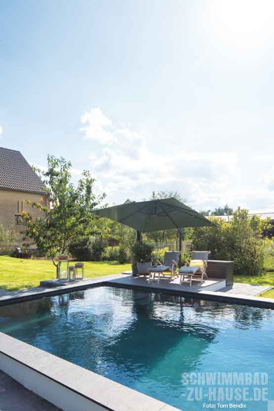 „Es war eine schöne Herausforderung, diesem Garten und der alten Scheune gleichermaßen gerecht zu werden, indem der neue Pool eine optische Verbindung zwischen modernem Neubau und ländlichem Ambiente herstellt“, fasst Jan Rambow die spannende Aufgabe zusammen. Das 12 x 3,5 x 1,5 Meter große Becken wurde so positioniert, dass die weiten Sichtachsen aus dem Innenhof durch die Scheune geschickt einbezogen werden konnten. Gemeinsam mit den Bauherren, die übrigens während der Rohbauleistungen selbst Hand anlegten, entschied sich das Team für eine dunkle Schwimmbadfolie. Die „Alkorplan Touch 3D“ von Renolit wirkt zum einen überaus elegant und verwandelt den Pool an sonnenfreien Tagen in einen spiegelnden See. Dank der schlichten Poolumrandung aus dunklen Fliesen wird ein dezenter Übergang zwischen Pool und Garten garantiert. Gleichzeitig fällt der neue Mittelpunkt des Gartens, der Pool mit hohem Wasserstand, aufgrund des nur zu Teilen eingelassenen Beckenkörpers ästhetisch ins Auge.