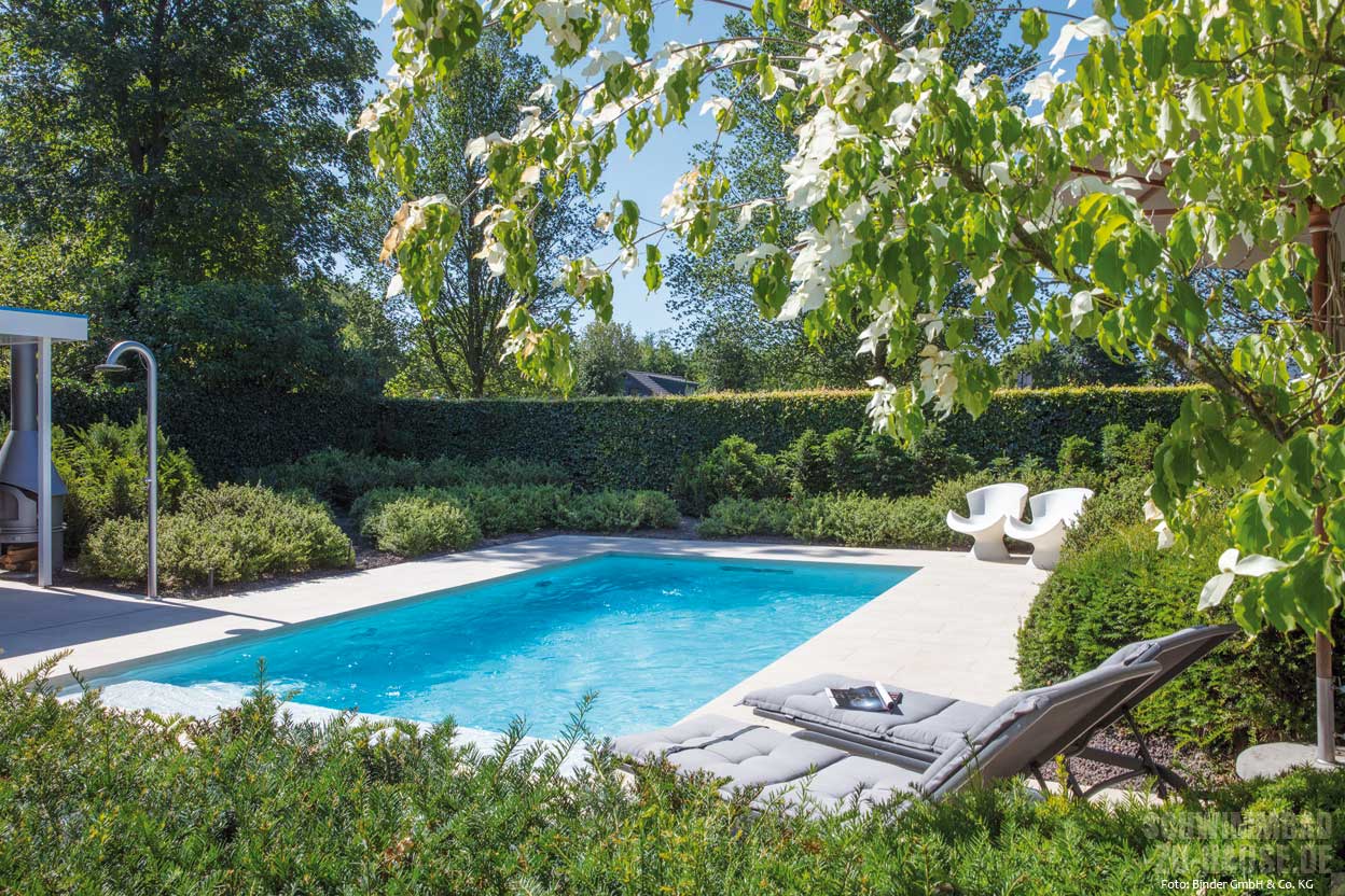 Das Ergebnis ist äußerst beeindruckend. Neben einer umfassenden Vegetation mitsamt Eibenbüschen und Eibenhecken und einem Taschentuchbaum in voller Blüte, der ein mediterranes Flair versprüht, vermitteln auch die zahlreichen Sitzmöglichkeiten ein echtes Urlaubsgefühl. Neben Sesseln und Liegen direkt am Beckenrand hat auch eine großzügige Eckcouch sowie eine Loggia mit Tisch und Stühlen zum gemütlichen Beisammensein den Weg in das Gartenreich der Roosens gefunden.