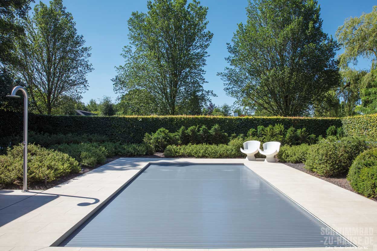 Frank Roosen schätzt die Anlage besonders, und er muss es wissen: Bereits seit knapp 30 Jahren ist er als Schwimmbadfachhändler tätig und weiß um die Stärken der Gegenstromanlage. Abgerundet wird das Poolzubehör von einer Heizung, die dank hochwertiger Sonnenkollektoren klimaneutral betrieben wird und einer Abdeckung, die vor Schmutz von außen schützt und obendrein die Temperatur des Wassers konstant hält.