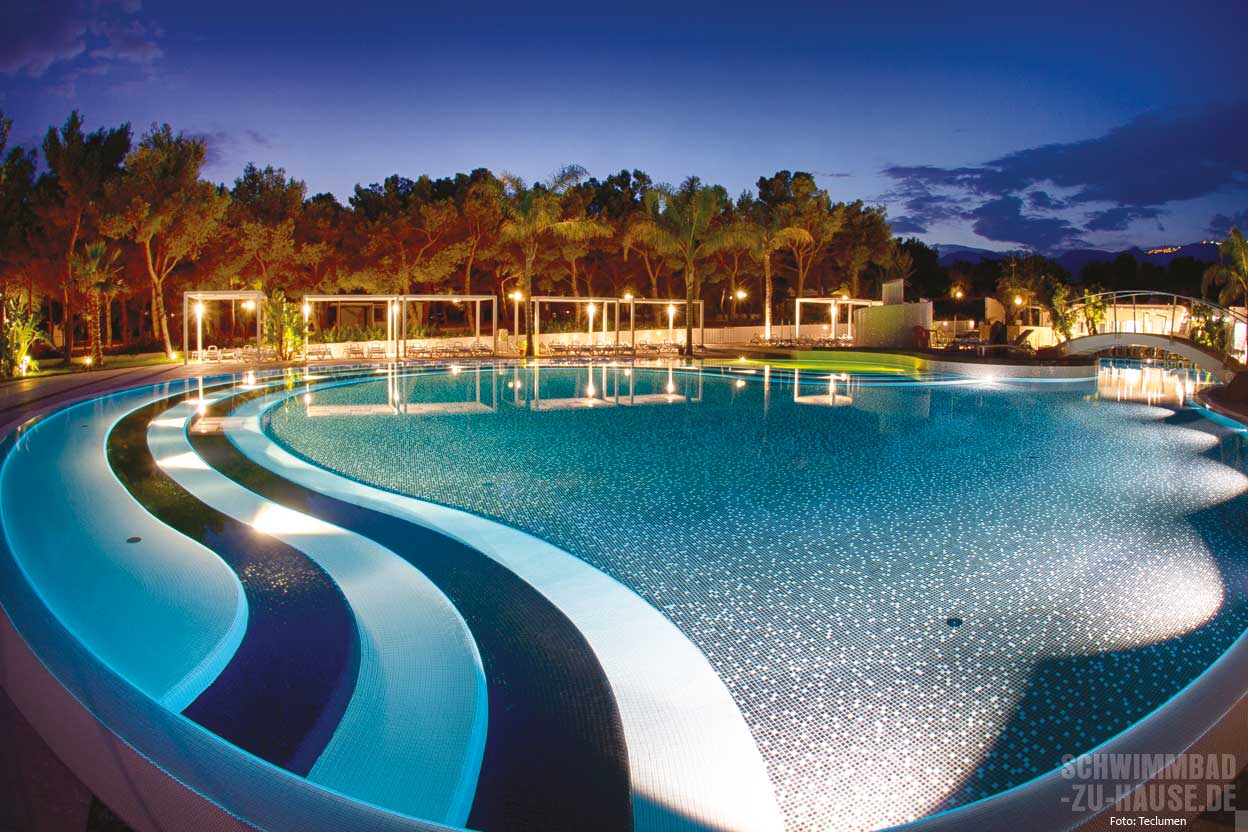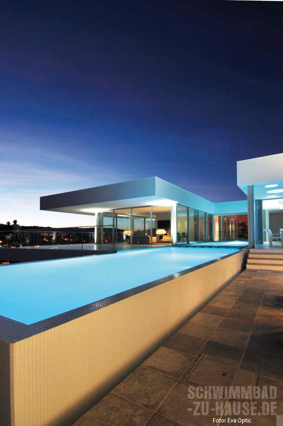Die Farben des Lichts beeinflussen unsere Stimmung erheblich. Ein blau beleuchtetes Schwimmbecken fördert die Entspannung und lässt den Alltag vergessen. Grün vermittelt Harmonie und inneres Gleichgewicht, während Rot anregend und erwärmend wirkt. Die Auswahl der Beleuchtung sollte daher sorgfältig geplant werden, um die gewünschte Atmosphäre zu schaffen. Dabei ist zu beachten, dass die Lichtwirkung von der Form, Größe und dem Material des Beckens abhängt. Während Mosaiksteine das Licht im Wasser ästhetisch brechen und so anmutig schimmern, entsteht bei der Unterwasserbeleuchtung eines Edelstahlpools ein anderer, etwas großflächigerer Lichteffekt. Bei Betonbecken empfehlen sich größere Scheinwerfer, die versetzt zueinander installiert werden.