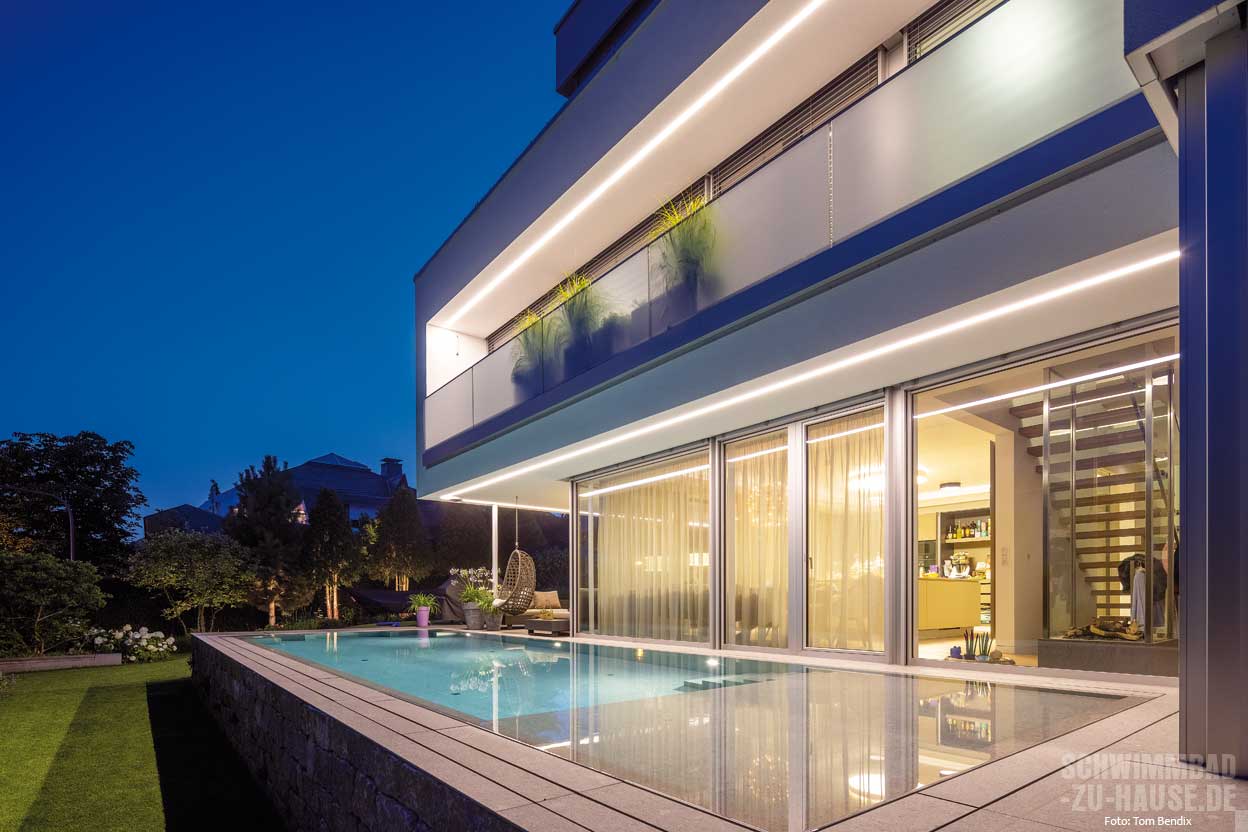 Ein weiterer Vorteil von Flachwasserzonen und Loungebereichen ist ihre ästhetische Funktion. Sie können das Design des Pools verbessern und ihm eine luxuriöse Note verleihen. Durch geschickt platzierte Loungebereiche und flache Wasserabschnitte kann ein Pool zu einem architektonischen Highlight im Garten werden und einen einladenden Raum für Unterhaltung und Entspannung schaffen. Abends, gut beleuchtet, gleicht die Wasserterrasse einer Lagune. Unterwasserscheinwerfer, die wohl überlegt in der