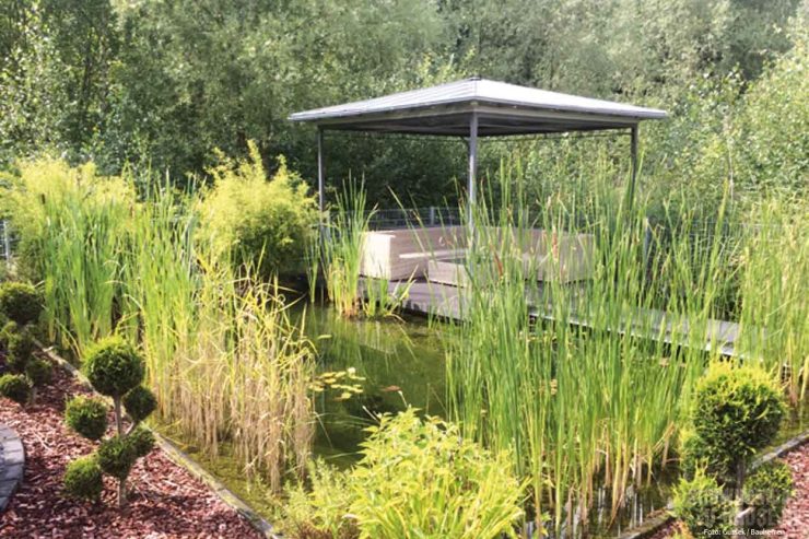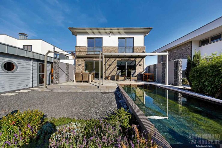 Genau aus diesem Grund setzt dieses Architektenhaus vom Hersteller Gussek Haus auf Luft nach oben. Durch das Walmdach gewinnt das Haus optisch an Höhe, ohne dabei Platz einzubüßen. Wasser und Design liegen den Hausherren schon immer sehr am Herzen. Die überdachte Terrasse, die perfekt zum Südwesten ausgerichtet ist, beschert hier ein sonniges Badeerlebnis im mit Folie ausgestatteten Naturpool. Als Teichtechnik wird ein Pumpensumpf und eine nachgeschaltete Filteranlage mit UVC-Filter der Firma Oase verwendet.