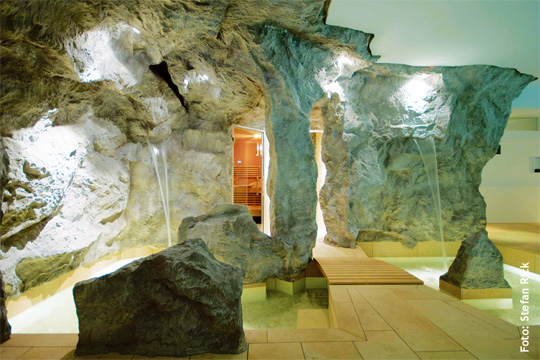 Die Sauna kann direkt vor Ort bedient werden. Hierher zieht sich Simon Fischer zurück, wenn er richtig schwitzen will. Und für den empfohlenen Kälteschock nach dem Saunagang steht eine Dusche bereit. Diese befindet sich etwas verborgen neben der Sauna und ist mit verschiedenfarbigen Mosaiken ausgekleidet. Braun, gelb, blau und grün glitzert es zwischen den Felsnachbildungen hervor. Auch ein Dampfbad findet man hier. Zu erreichen ist dieser Bereich über eine kleine Brücke bei den Kneippbecken – es schwingt ein Hauch von Abenteuer mit, wenn man sich durch die Felsenlandschaft tastet.