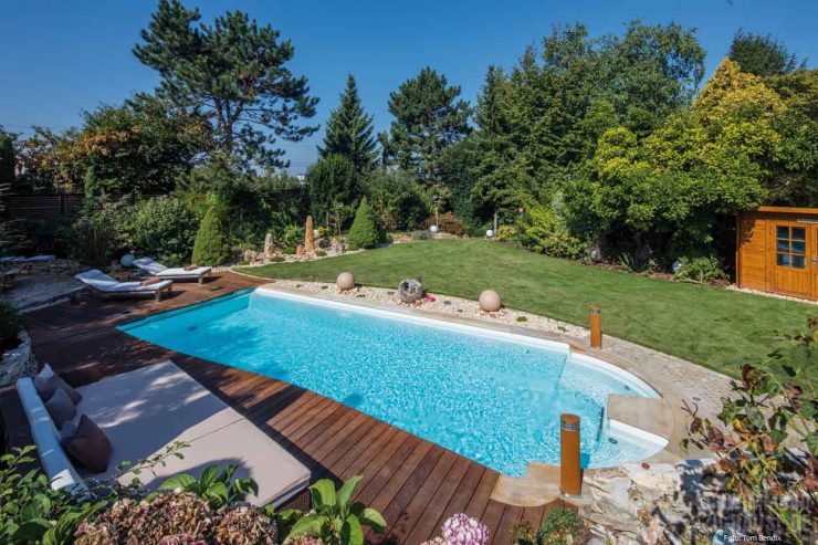 Da die Familie Ihren Urlaub vorzugsweise in der Toskana verbringt und das Haus bereits design- und farbtechnisch an die Urlaubsregion anknüpft, war klar, dass der erträumte Gartenpool ebenfalls diesen Stilvorgaben gerecht werden muss. Es folgte eine zweijährige Planungsphase, während der sich die Bauherren Inspirationen in Fachzeitschriften holten und sich letztendlich für einen Südtiroler Fertigbeckenhersteller entschieden. „Da wir im Großraum Karlsruhe als Partner von Polyfaser gelistet sind, kam der Kontakt zwischen der Familie und uns relativ schnell zustande“, sagt uns beim Interview Ralf Weiß von RS Pools & Spas und ergänzt „Der Wunsch nach einem Fertig-Becken wurde nach dem Besuch in den Werkshallen von Polyfaser verfestigt. Unsere Kunden wussten bereits, dass es das Modell Karibik in der Farbe antiquiert beige sein musste. Auch dass eine Gegenstromanlage von Uwe integriert sein musste, stand zu diesem Zeitpunkt bereits fest“.