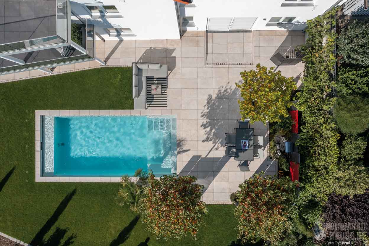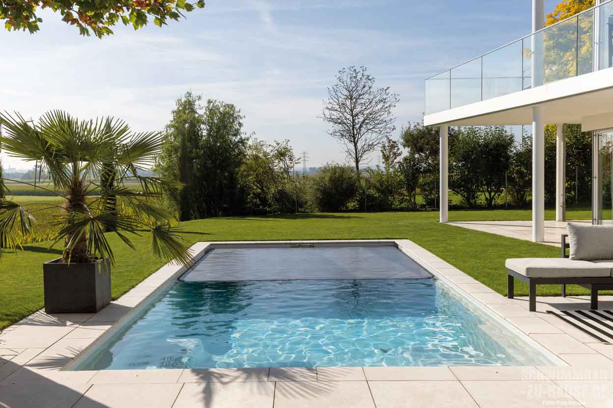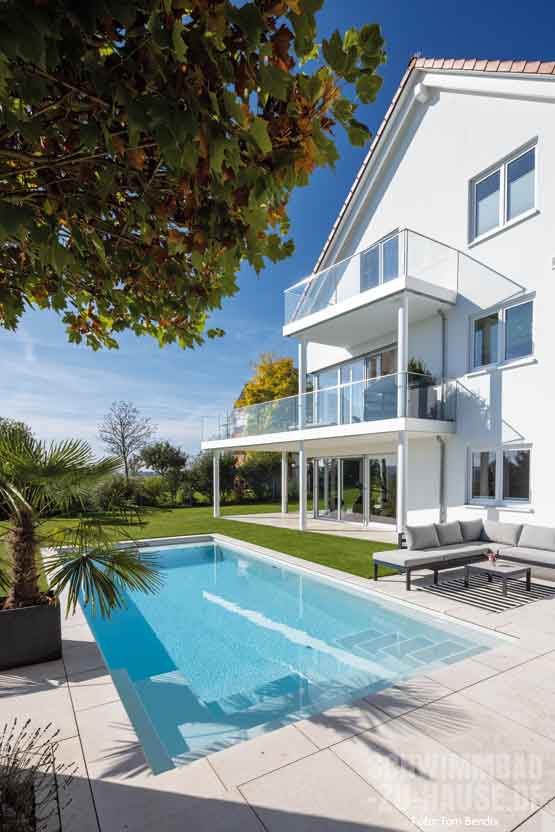 Die Terrasse dieser Familie im oberschwäbischen Meckenbeuren ist der perfekte Ort, um vom Alltag abzuschalten: Elegante Loungemöbel laden zum Entspannen ein, Palmen sorgen für Urlaubsfeeling und ein Pool bietet Badespaß pur. Dank der turbinenbetriebenen Gegenstromanlage „Hydrostar“ verwandelt sich das Becken auf Knopfdruck sogar in eine kleine Fitness- und Wellnessoase.