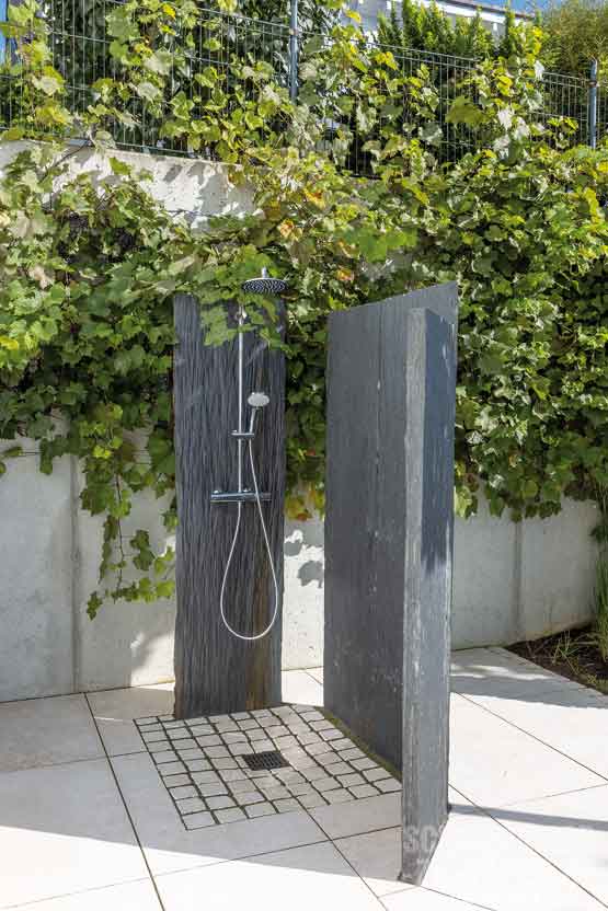 Farbtechnisch entschied man sich für die Ausführung „Papyrus“. „Das ergibt ein ganz helles Grau, wodurch ein natürlich-bläulicher Wassercharakter entsteht“, beschreibt Steffen Bergmann den Effekt. Als Schutz vor Schmutz und um die Wassertemperatur möglichst konstant zu halten, hat sich das Ehepaar außerdem eine Schwimmbadabdeckung mit hagelfesten Solarlamellen aus Polycarbonat einbauen lassen. Der Rollladenschacht „Integra 2-13“ wird unterflur montiert und ermöglicht dadurch einen besonders hohen Wasserstand. In ihm wird das Wasser durch eine Mess- und Regelanlage von Ospa vollautomatisch