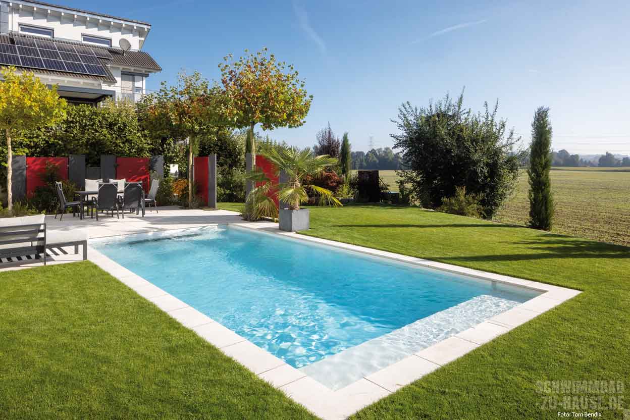Von der Bank aus hat man einen idyllischen Blick auf weite Felder. Hier sitzt das Ehepaar oft und genießt die herrliche Ruhe. Die Bauherren sind aber auch sehr sportlich und powern sich gerne mal aus. Deshalb haben sie vor einiger Zeit bei Steffen Bergmann, einem erfahrenen Schwimmbadbauer vom Bodensee, einen Pool in Auftrag gegeben. Bergmann empfahl ihnen das Becken „Modena Style 875“ aus der „D-Line“ von Riviera Pool, das sich durch klare Linien und Strukturen auszeichnet. In das 3,20 x 8,75 Meter große Becken gelangt man mit wenigen Schritten von der Terrasse aus über eine in den Pool integrierte Treppe.