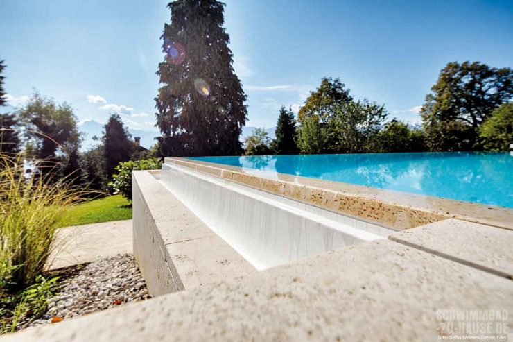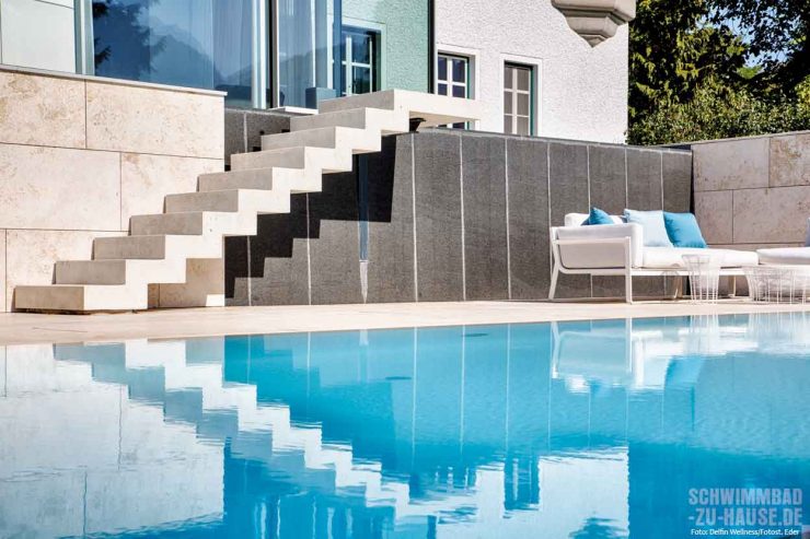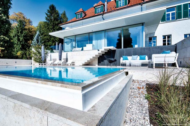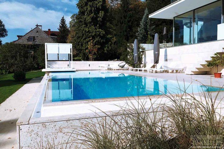 Doch wie kann man den Freizeitfaktor noch toppen, fragten sich die jungen Bauherren. Die Antwort war: ein eigener Pool! Denn wenn es draußen sonnig und heiß ist, gibt es kaum etwas Besseres als ein erfrischendes Badeparadies, in dem man sportlich seine Bahnen ziehen oder einfach nur relaxen kann. Die Vorstellungen des Paares bezüglich Gestaltung und Ausstattungen des Outdoor-Pools waren von Beginn an sehr konkret: Das Becken sollte unterhalb des weißen Wohnhauses und des modernen Wintergartens in den Hang gebaut werden. Optisch bevorzugte man helle, beinahe weiße Farben und eine stringent geradlinige Formensprache. Um den weiten Ausblick in die Natur in vollen Zügen genießen zu können, wünschten sich die Bauherren darüber hinaus einen Infinity-Pool. Der hohe Wasserstand ermöglicht hier das Schwimmen exakt auf gleicher Höhe mit der Umgebung. Kein Beckenrand versperrt die Sicht. Zudem sollten beide Ebenen der Outdoor-Oase eine architektonisch homogene Verbindung erhalten.