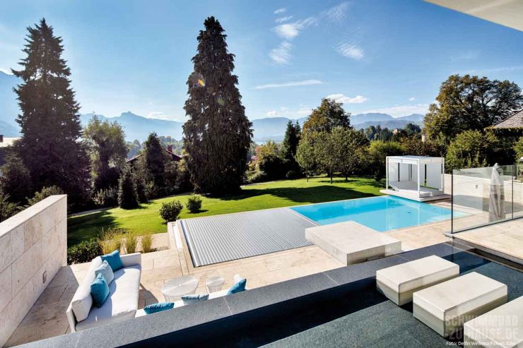 Und auch in Sachen Energieeffizienz hat das Freibad mit seinem blau schimmernden Badewasser einiges zu bieten. Neben den modernen Filterpumpen mit Frequenzumrichter, die drei Geschwindigkeiten umfassen, und der sparsamen Nachtabsenkung des Wassers ist in diesem Kontext vor allem die PC-Solar-Rollladenabdeckung zu nennen. Sie wird bei Nichtbenutzung des Pools einfach über die Wasseroberfläche gefahren und minimiert so die Wärmeverluste. Zugleich gelangen Verschmutzungen von außen nicht ins Becken. Letzteres garantiert – gemeinsam mit einer automatischen Wasseraufbereitung – dass die Familie das neue Badeparadies sorgenfrei genießen kann.