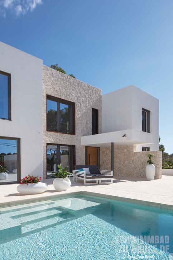 Wie holt man sich das Meer direkt hinters Haus? Für Familie Neher (Name von der Redaktion geändert) war die Antwort glasklar: mit einem eigenen Pool im Garten. „Wir hatten von Beginn an sehr konkrete Vorstellungen“, verrät Oliver Neher. „Neben einer türkisfarbenen Wasserfarbe sollte sich der Pool harmonisch in das architektonische Gesamtbild unseres Ferienhauses in Porto Petro einfügen.“ Dies war eine besondere Aufgabe, da sich größere Felsen an der für den ebenerdigen Pool geplanten Stelle befanden. Für ein derartiges Vorhaben bedarf es ohne Frage eines Teams aus erfahrenen Experten. Britta und Oliver Neher beauftragten Architekt Toni Vidal und den auf Mallorca ansässigen Schwimmbadprofi Frank Grigull mit der Planung und Realisation ihres neuen Traumpools.