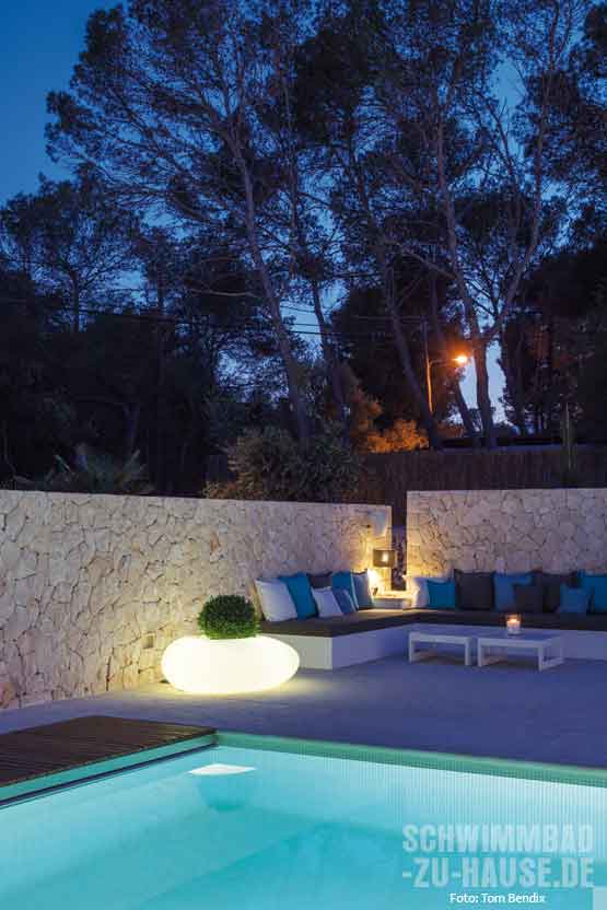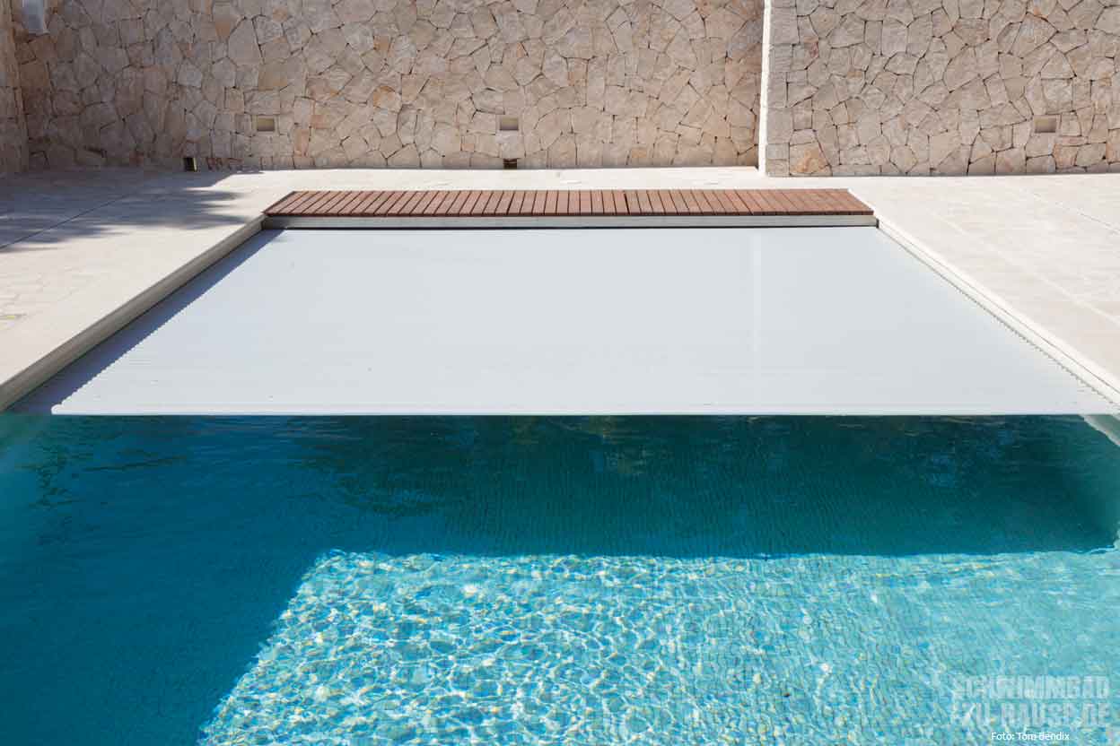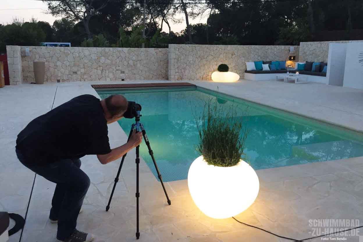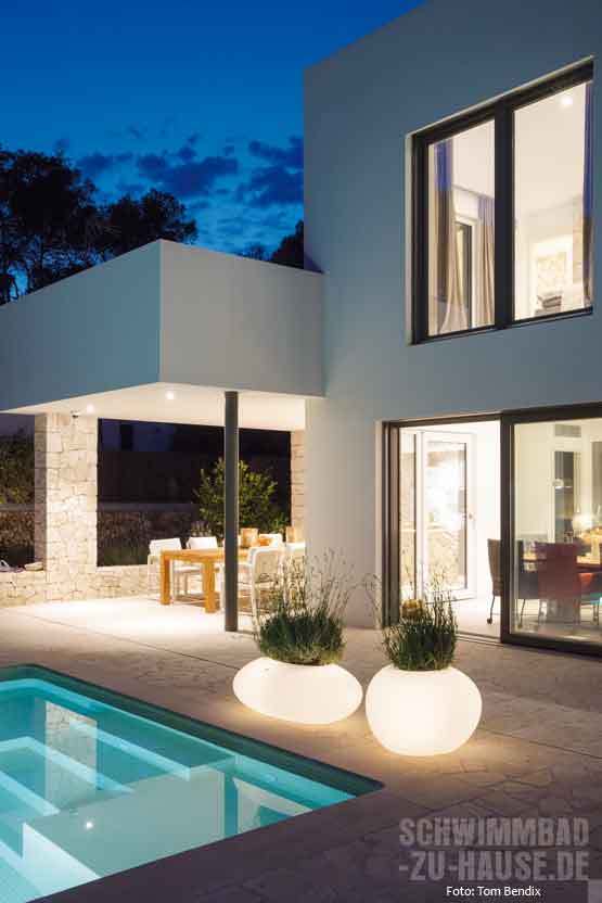 „Da der Bauherr regelmäßig über das ganze Jahr verteilt immer wieder ein paar Tage oder auch Wochen nach Mallorca in sein Haus fliegt, war es einer der Wünsche, einen Pool zu konzipieren, der ganzjährig genutzt werden kann“, skizziert Frank Grigull die Vorstellungen von Oliver Neher. Um das Wasser 365 Tage im Jahr auf konstanten 28 Grad halten zu können, wurde eine Drei-Stufen-Schwimmbadheizung auf Wärmepumpenbasis installiert. Ergänzend hierzu verhindert eine Rollladenabdeckung im geschlossenen Zustand und bei Nichtnutzung des Beckens zu große Wärmeverluste und hält Laub sowie Äste fern.