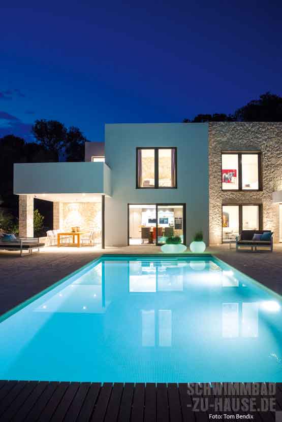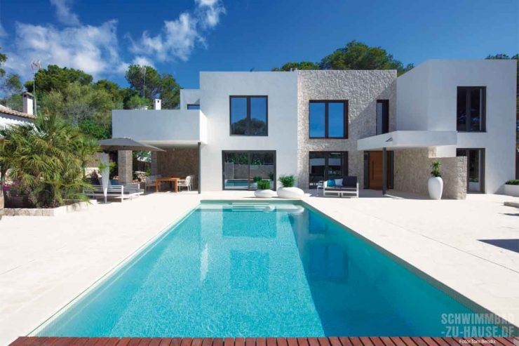 Helles Türkis ist die Farbe des Meeres ihres Lieblingsstrands auf Mallorca. Genauso sollte auch das Wasser im neuen Pool hinter dem Haus dieser Familie schimmern. Weitere Wünsche waren die ganzjährige Nutzung des Schwimmbads, geringe Betriebskosten und die Positionierung des Beckens in Relation zum Haus. Mithilfe eines professionellen Teams aus Architekt und Schwimmbadbauer entstand so ein Pool, der alle Erwartungen übertrifft.