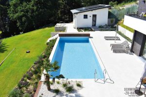 Doch nicht nur äußerlich, sondern auch in technischer Hinsicht kann sich dieses Pool-Projekt sehen lassen. Neben einer automatischen Wasseraufbereitungsanlage für einwandfrei klares Badewasser installierten die Profis eine vollautomatische Rollladenabdeckung, die das Wasser bei Nichtbenutzung vor Verschmutzungen und Wärmeverlusten schützt. Apropos Wärme: Eine Luftwärmepumpe mit Photovoltaikanlage sorgt für angenehme Temperaturen, ohne dabei die Energiekosten in die Höhe schnellen zu lassen.