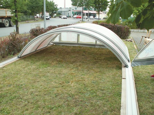 Wie bei einem Schrank aus dem SB-Markt erläutert eine ausführliche Aufbauanleitung die einzelnen Arbeitsschritte. Nach dem Befestigen der Bodenschienen werden die einzelnen Segmente der Schiebeüberdachung nacheinander montiert und auf die Laufschienen gesetzt. Die im Werk vormontierten Frontseiten werden anschließend mit den beiden Endsegmenten verschraubt. Es folgen noch einige Silikonarbeiten – und schon ist die Überdachung fertig. Während die Montagearbeiten bequem von zwei Personen durchgeführt werden können, sollten für das Aufsetzen der bis zu 150 kg schweren fertigen Segmente nach Möglichkeit mehrere starke Hände verfügbar sein.