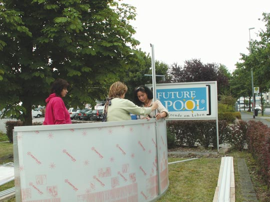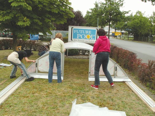 Um zu demonstrieren, wie einfach der Aufbau vonstatten geht, haben drei mutige Damen aus dem Verkaufsteam des Anbieters Future Pool kurzerhand die Poolüberdachung aus dem Karton im Vorgarten der Firma aufgestellt. Keine der Damen hatte vorher Erfahrung bei der Montage einer Poolüberdachung – trotzdem wurde sie innerhalb von sagenhaften zwei Stunden und 15 Minuten fertiggestellt. Das Motto der tatkräftigen Damen war an diesem Tag schlicht und einfach: Tu es!