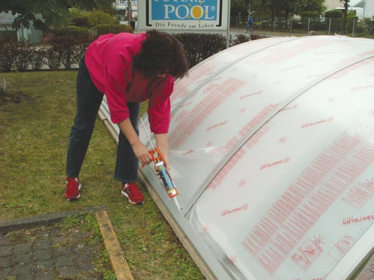 Wie bei einem Schrank aus dem SB-Markt erläutert eine ausführliche Aufbauanleitung die einzelnen Arbeitsschritte. Nach dem Befestigen der Bodenschienen werden die einzelnen Segmente der Schiebeüberdachung nacheinander montiert und auf die Laufschienen gesetzt. Die im Werk vormontierten Frontseiten werden anschließend mit den beiden Endsegmenten verschraubt. Es folgen noch einige Silikonarbeiten – und schon ist die Überdachung fertig. Während die Montagearbeiten bequem von zwei Personen durchgeführt werden können, sollten für das Aufsetzen der bis zu 150 kg schweren fertigen Segmente nach Möglichkeit mehrere starke Hände verfügbar sein.