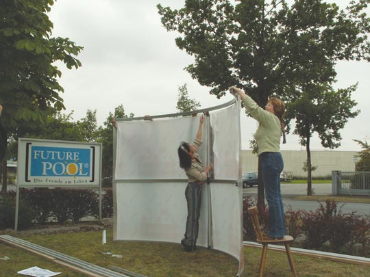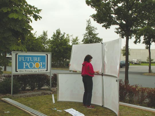 Um zu demonstrieren, wie einfach der Aufbau vonstatten geht, haben drei mutige Damen aus dem Verkaufsteam des Anbieters Future Pool kurzerhand die Poolüberdachung aus dem Karton im Vorgarten der Firma aufgestellt. Keine der Damen hatte vorher Erfahrung bei der Montage einer Poolüberdachung – trotzdem wurde sie innerhalb von sagenhaften zwei Stunden und 15 Minuten fertiggestellt. Das Motto der tatkräftigen Damen war an diesem Tag schlicht und einfach: Tu es!