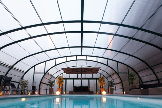 Bei Vöroka (hier Modell „Exclusiv“, Bild 1) besteht die Möglichkeit, beide Seiten der Überdachung mit unterschiedlichen Platten auszuführen. Beispielsweise die hohe Längsseite in Doppelsteg (Sichtschutz) und die schräge Seite in glasklar (mehr Einblick ins Badevergnügen). Die Überdachung „Sublim“ (Bild 4) von Vöroka ist eine flexible Lösung für einen Poolschutz. Bei der Entwicklung des Modells sind zwei Überdachungen (eine hohe Überdachung und eine halbrunde Halle) zu einer verschmolzen. Die Verglasung besteht aus vier Millimeter starkem, durchsichtigem Polycarbonat an den Seiten und acht Millimeter starken Doppelstegplatten als Dach. Eine weitere Ausführung ist das Modells „Royal“. Die riesigen Verkleidungselemente sind 4 mm dicke, massive Polycarbonat-Dachplatten. Sie haben einen doppelseitigen UV-Schutz, sind bruchsicher und schlagfest. Wahlweise hat Vöroka auch 8 mm dicke Polycarbonat-Doppelstegplatten in der Produktschiene vorrätig. Der Plattenhersteller gewährt eine 10-jährige Garantie auf die Witterungsbeständigkeit der Polycarbonat-Platten.