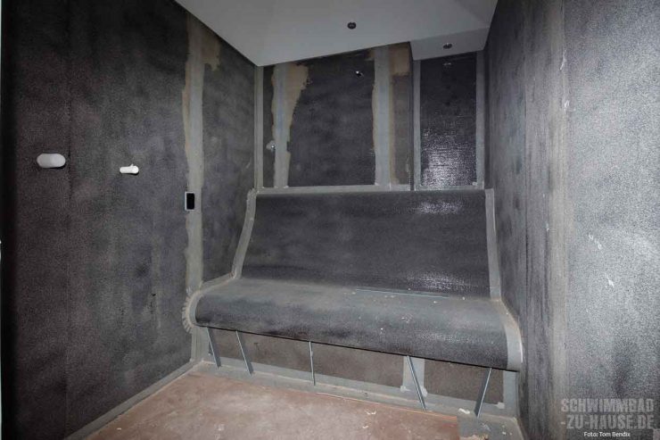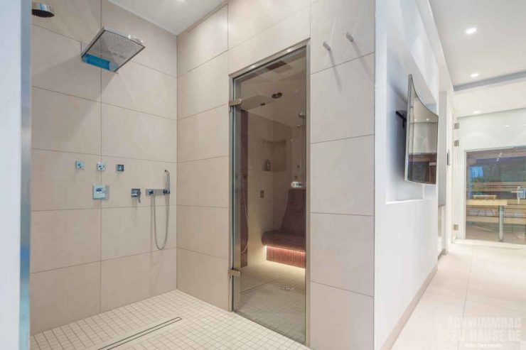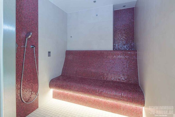 Beim Bau des Dampfbads kam das spezielle Wedi-System zum Einsatz, das dem Bauherrn Schwitzvergnügen auf höchstem Niveau garantiert. Und wenn sich ein Familienmitglied etwas höhere Temperaturen wünscht, dann kann es auf die daneben verbaute Sauna ausweichen.