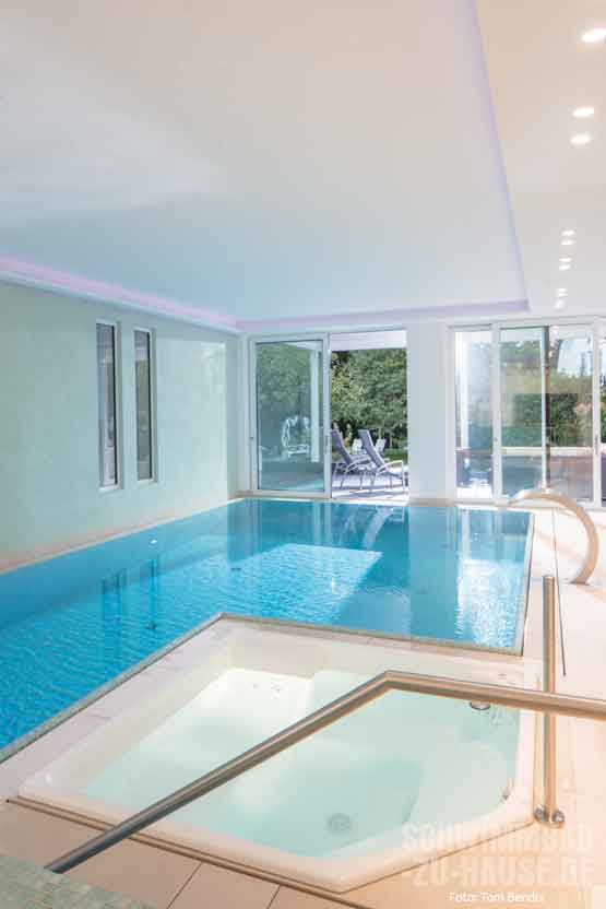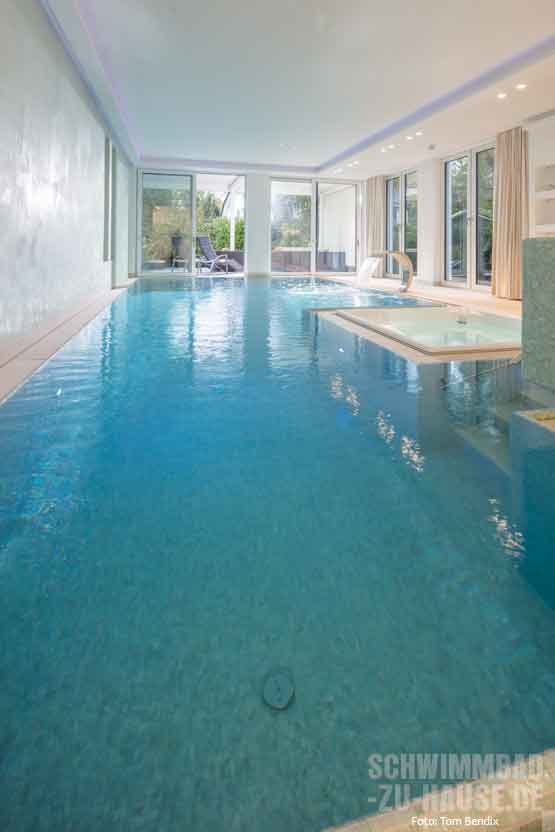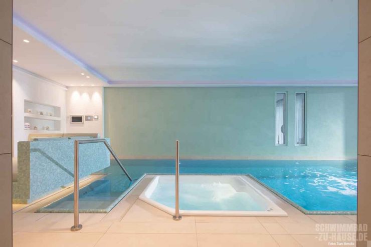 Wenn der Bauherr Fußball auf höchstem Niveau liebt und das Sehvergnügen mit dem Wellnesselement verbinden möchte, dann liegt es auf der Hand, dass das Endergebnis beeindrucken muss. Am Ende des Tages wurde eine Halle erbaut, die mit einem Überlauf-Pool, Sauna, Dampfbad, Whirlpool, Gegenstromanlage und einer hochmodernen Ultrafiltrationsanlage für den Privatbereich beeindruckt. Man kann also sagen: Mehr Wellness im privaten Bereich geht nicht.