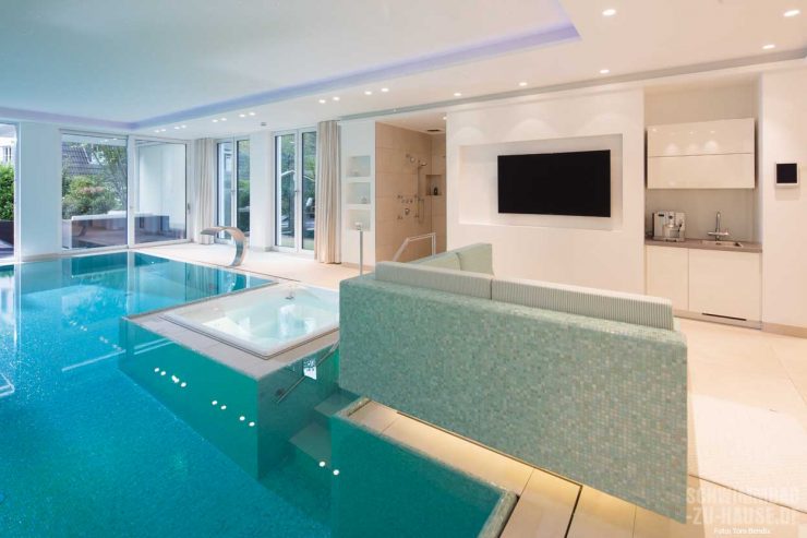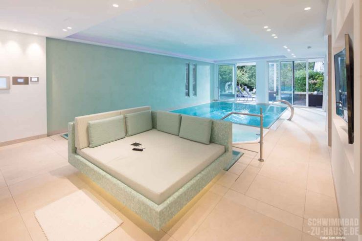 Dabei war die Planung, Vorbereitung und Ausführung einer aus Mosaikfliesen ausgeführten Überlaufrinne mit einer Rinnenabdeckung aus Fliesen sicherlich eine Herausforderung. Schließlich musste die Unterkonstruktion in alle Richtungen justierbar sein, um sowohl die Höhe, als auch die Fugenbreite genau einstellen zu können. Das äußerst anspruchsvolle Betonbecken mit einer maximalen Länge von 9,80 Meter wurde zudem mit einer Schwalldusche und einer Gegenstromanlage ausgestattet. Bei der Wasseraufbereitung entschloss sich der Bauherr, auf das hochmoderne und besonders exklusive Ultrafiltrationsgerät „spaliQ:UF150“ zurückgreifen. Die gesamte Pooltechnik samt der vollautomatisierten Wasseraufbereitung wurde in das smarte Bus-System eingebunden, sodass der Bauherr alles mit einem Gerät im Griff hat und keine Insellösung in Kauf nehmen muss. Den richtigen Riviera-Whirlpool hat man in unmittelbarer Nähe zur Überlaufrinne des Schwimmbeckens positioniert und die mit LEDs indirekt beleuchtete Ruheliege scheint geradezu über dieser zu schweben. Eine perfekte TV-Lounge eben.