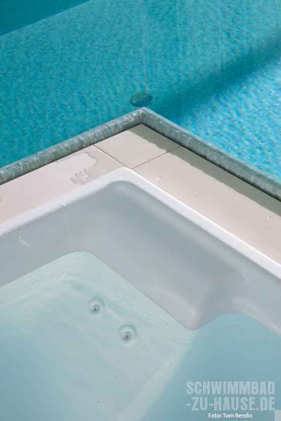 Bei der Umsetzung der komplexen Gesamtaufgabe kam es darüber hinaus auf eine reibungslose Zusammenarbeit zwischen der Innen- architektin, den Betonspezialisten sowie den Poolprofis. So wurde beispielweise schon beim Versetzen der Überlaufrinne als Rohbaustein am Übergang Whirlpool zu der dreiseitig umlaufenden Überlaufrinne vom Schwimmbecken eine 1:1 Schablone vom bereits gefertigten Whirlpool angefertigt, damit Abweichungen im Produktionsprozess des Whirlpools nicht zu keilförmig zulaufenden Fliesen an der Überlaufrinne führen. Auch beim Warmluftschleier der Entfeuchtungsanlage wurden im Design-Center Modifikationen im Vergleich zum ursprünglichen Plan vorgenommen, wie wir auf Nachfrage erfuhren: „Die Zuluftführung sollte jetzt, strömungstechnisch wesentlich günstiger, von unten nach oben über Schlitzschienen vor den Fensterelementen geführt werden. Die Verrohrung für die Luftführung, die Verrohrung der Gegenstromschwimmanlage und die Entwässerungspunkte der Überlaufrinne wurden bereits in der Rohbauphase auf einer Höhe von ca. 2,75 Meter vorverrohrt und in die Wand einbetoniert. Die gesamte Konstruktion wurde auf einer Breite von ca. 0,75 Meter in drei Schichten realisiert (Kelleraußenwand, Rohrführung und Beckeninnenwand). Gleichzeitig musste der Standard WU Beton erhalten bleiben.“