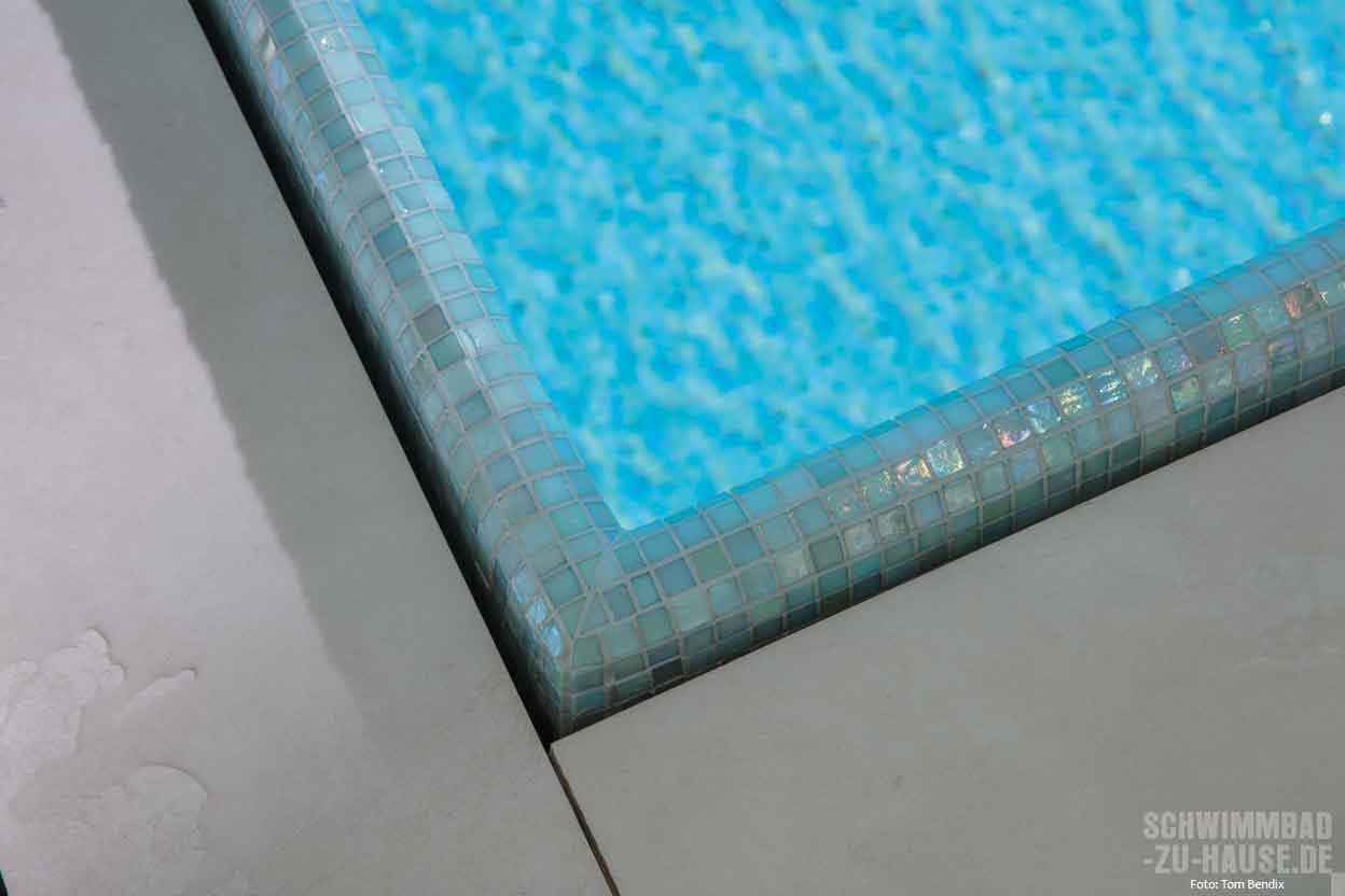 Es stellte sich dabei schnell heraus, dass das geplante Skimmerbecken nicht dem Anspruch des Bauherrn entspricht und nur aufgrund schlechter Erfahrungen einen Kompromiss darstellt. Michael Blechschmidt von Massar erklärt uns, wie die Schwimmbadspezialisten das Problem der Ablaufgeräusche in den Griff bekommen haben, sodass die Entscheidung zugunsten eines Mosaikbetonbeckens mit Überlaufrinne fiel: „Um Überlaufgeräusche zu vermeiden, wurden die Rinnenabläufe direkt unterhalb der Überlaufrinne waagerecht verzogen. Weiter wurde eine Umschaltung installiert, welche auf Knopfdruck eine interne Umwälzung gewährleistet, ohne dass das Beckenwasser über die Rinne läuft. Somit beeinflussen keinerlei Überlaufgeräusche die Raumakustik.“