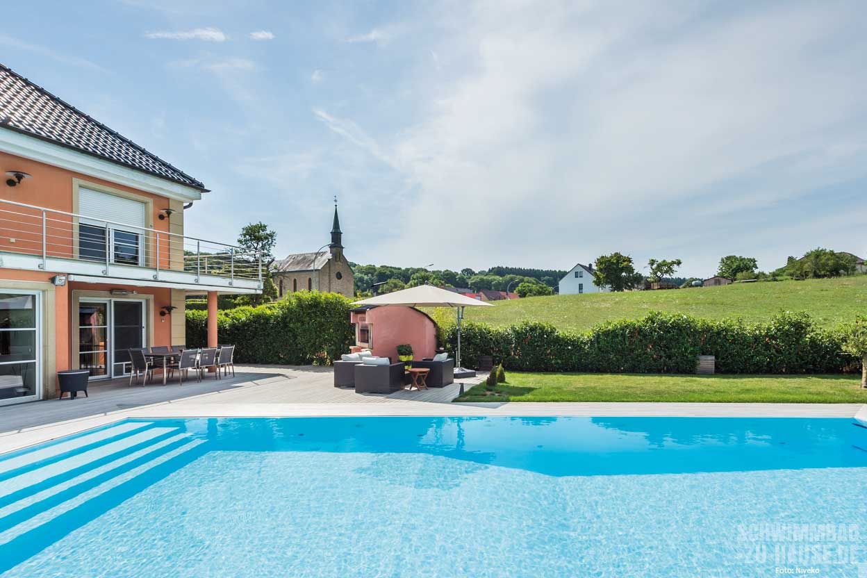 Ursprünglich dachte der Bauherr aus Luxemburg nicht daran, einen Pool in den Garten hinter dem Haus zu bauen. Doch nachdem seine Kinder ihn immer und immer wieder darum baten und die Vorteile eines eigenen Schwimmbads geschickt herausarbeiteten, ließ er sich überreden – und aus dem Garten wurde ein Badeparadies der Extraklasse, an dem nicht nur die Kinder ihre Freude haben …