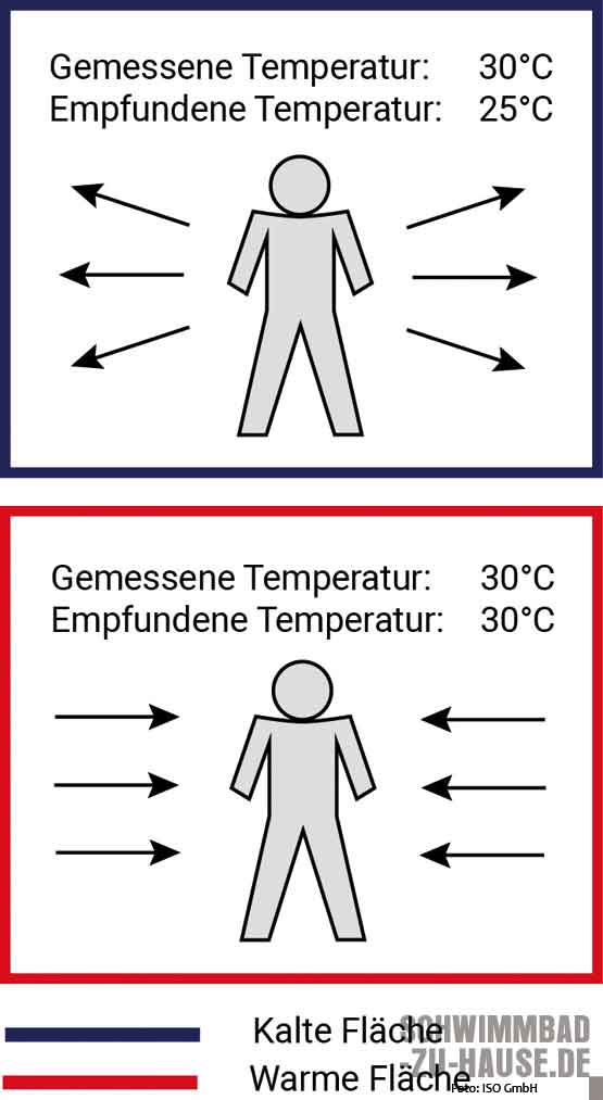 Mit einer Temperatur von rund 30 Grad und etwa 60 Prozent Luftfeuchtigkeit wirkt das Schwimmhallenklima im ersten Moment zwar sehr warm, es ist jedoch so ausgelegt, dass sich der Schwimmer in Badekleidung wohlfühlt, wenn er nass aus dem Wasser kommt. Raum- und Oberflächentemperatur der Umgebungsflächen erhöhen sich bei besserem Wärmeschutz und tragen maßgeblich zur Behaglichkeit bei. Eine kühle Oberfläche führt unter diesen Klimabedingungen schnell zu einer unangenehmen Zugluft. Bei kalten, also ungedämmten, Wänden empfindet man die Temperatur im Raum niedriger als sie tatsächlich ist.