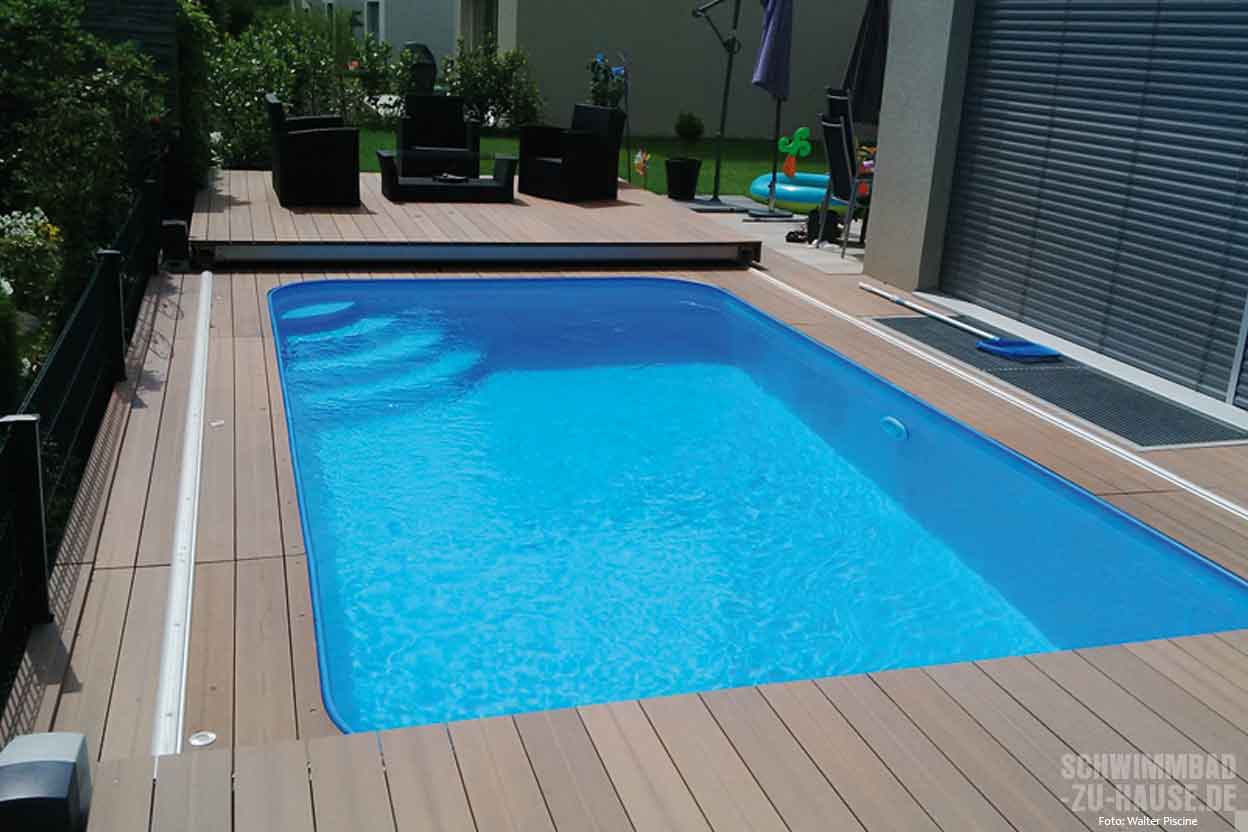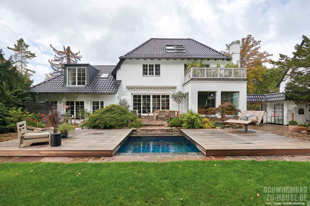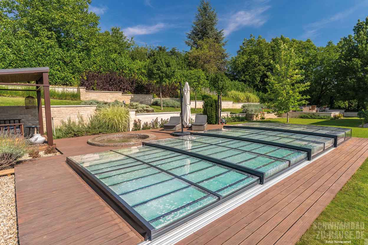 Eine andere Art der Poolüberdachung sind Pooldecks. Auch sie halten Schmutz fern, bieten Sicherheit für Kinder und Tiere und verringern Wärmeverluste. Ihr Vorteil gegenüber konventionellen Poolüberdachungen ist, dass sie sich als Terrasse nutzen lassen. Damit sie sich optimal in die Gartenarchitektur einfügen, können Sie die Oberflächen oft anpassen. Wofür gewöhnliche Pooldecks nicht gedacht sind: unter ihnen zu schwimmen, so wie es die meisten konventionellen Poolüberdachungen erlauben.