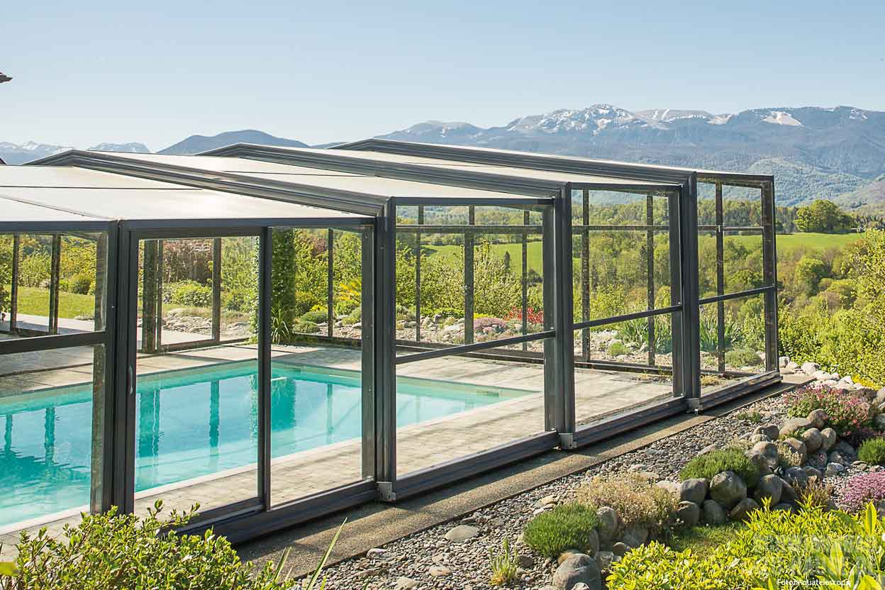Eine flache Überdachbung hat den Vorteil, dass diese sich in die Gartenarchitektur optimal einpasst, und Sie haben auf der Terrasse weiter die Aussicht, zum Beispiel auf den Garten oder die Berge. Nachteil: Flache Ausführungen bieten weniger Platz unter der Poolüberdachung. Dennoch können Sie unter vielen Überdachungen schwimmen – vorausgesetzt die Höhe erlaubt es.