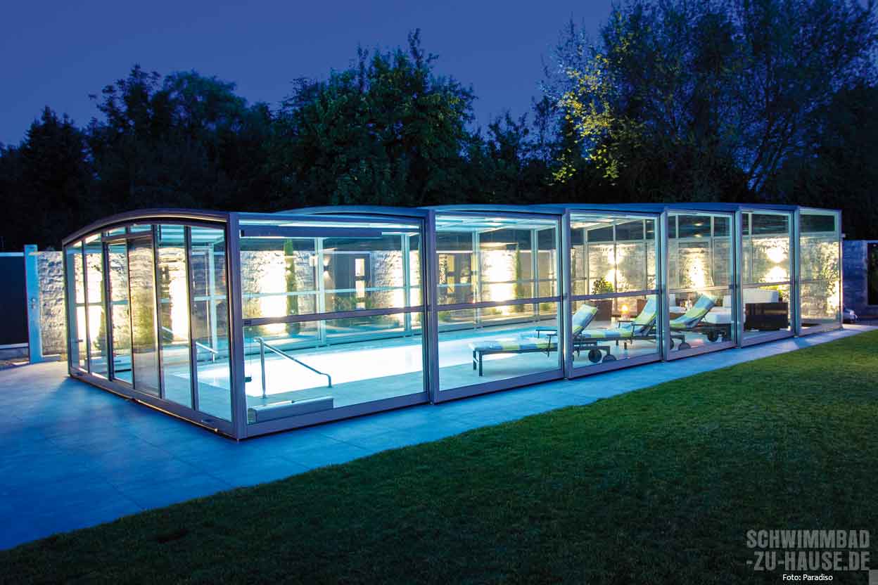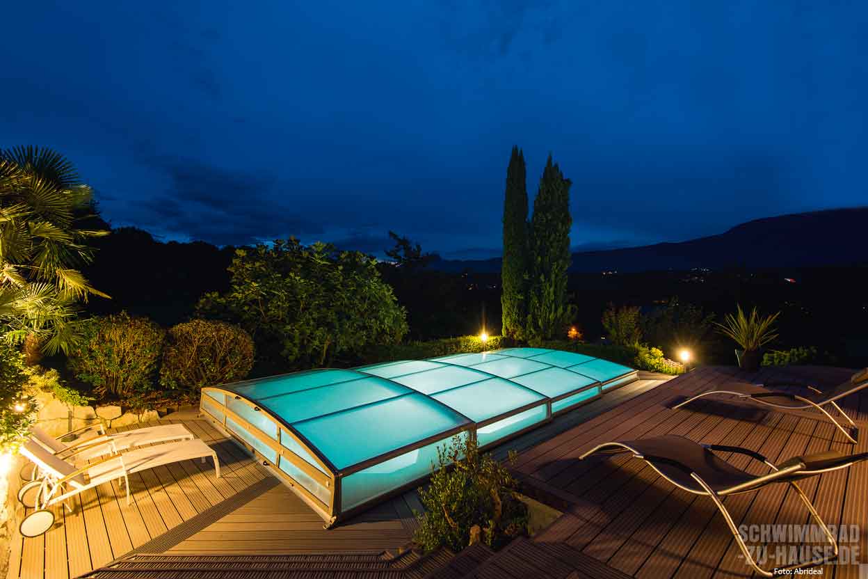 Schade nur, dass in Deutschland die Temperaturen über mehrere Monate hinweg nicht immer zum Baden im Outdoorpool einladen. Mit einer Poolüberdachung lässt sich diese Zeit aber angenehmer gestalten oder verlängern. „Durch eine Überdachung können Sie den Pool im Frühjahr vier bis sechs Wochen früher und im Herbst drei bis fünf Wochen länger nutzen“, so die Erfahrung von Bodo Maertsch, Niederlassungsleiter vom Poolüberdachungs-Hersteller Abridéal.