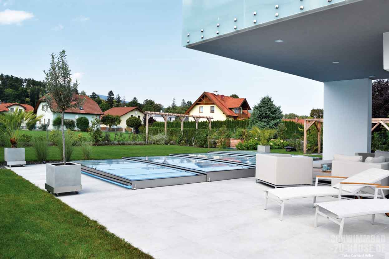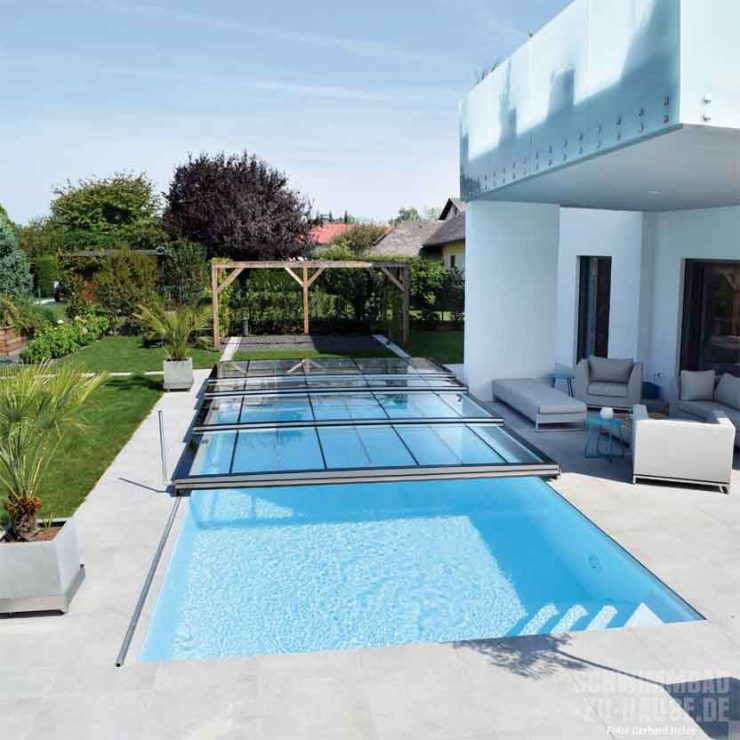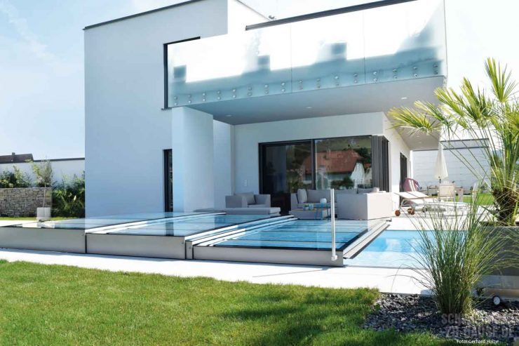 Mithilfe einer Poolüberdachung lässt sich die Badesaison verlängern und es gibt viele weitere Vorteile, beweist dieses Objekt. Im Zuge des Baus eines neuen Hauses entschied sich diese Familie auch gleich dafür, einen neuen Pool bauen zu lassen. Ganz oben auf der Wunschliste für das Badeparadies: so wenig Arbeit mit der Pflege wie möglich, ein zeitgemäßes Aussehen und vor allen Dingen eine verlängerte Badesaison durch eine Poolüberdachung.