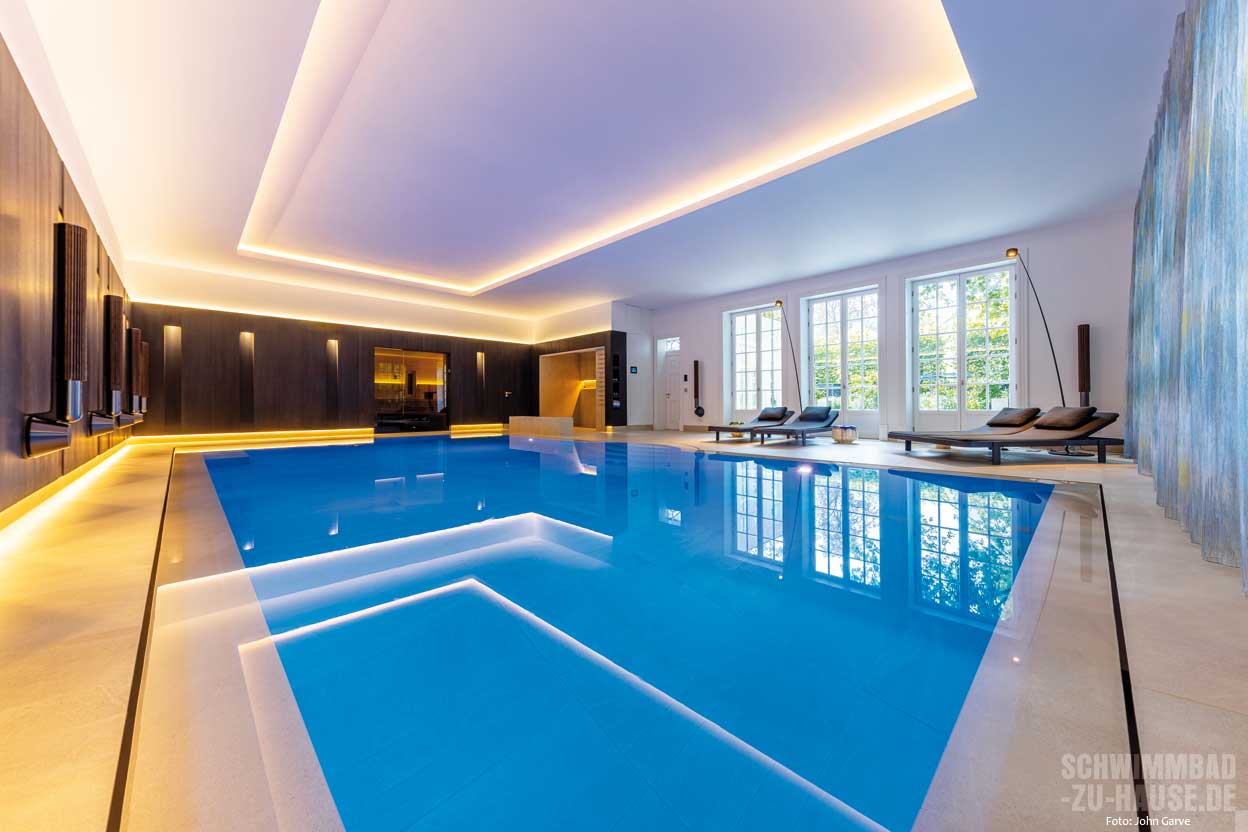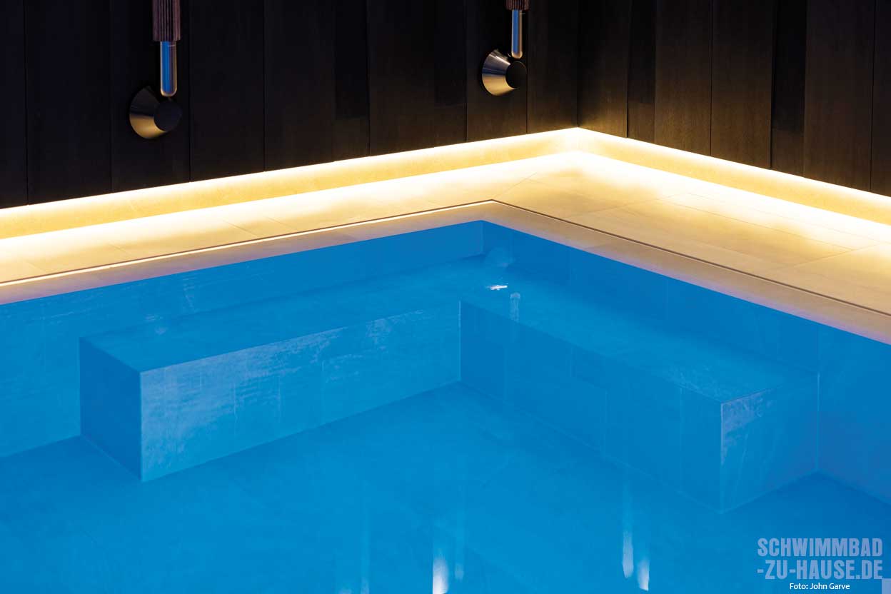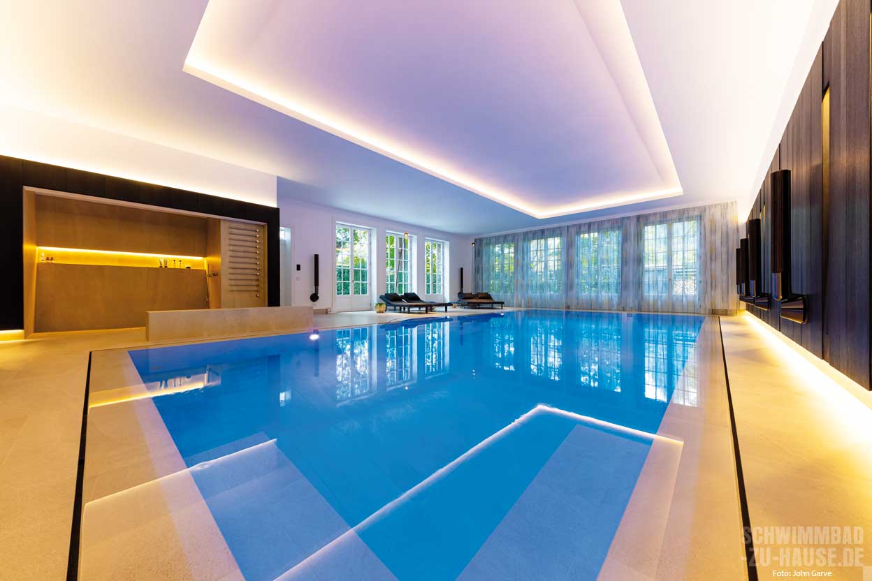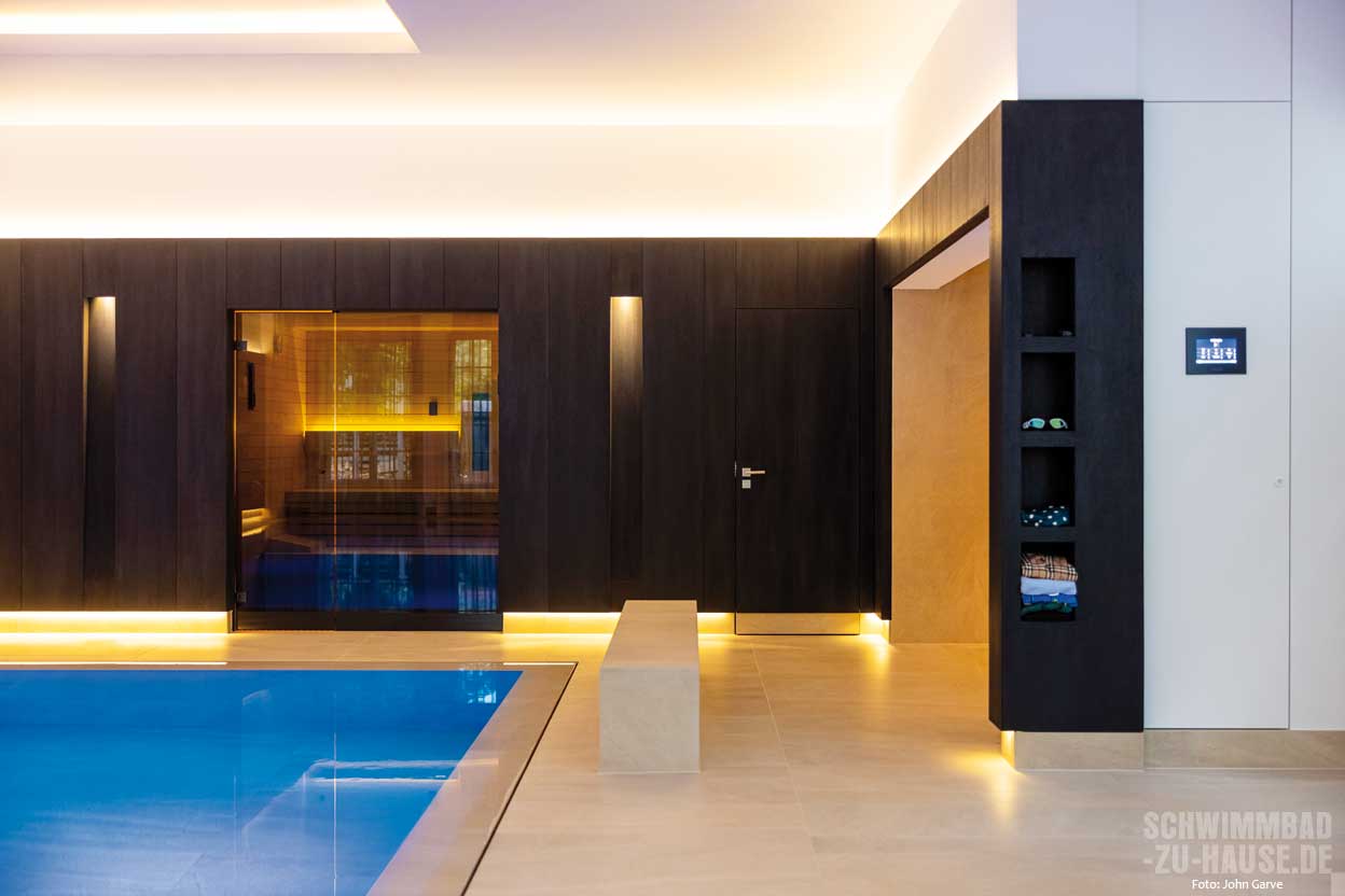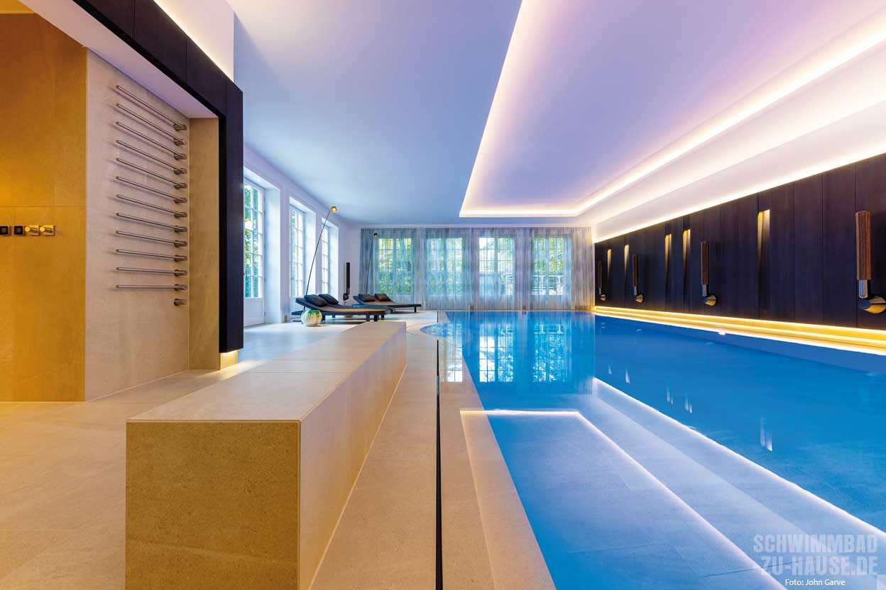 Der Pool selbst misst 5 x 11 x 2,5 Meter und verfügt über technisch ausgereifte Lösungen wie Pumpen, Scheinwerfer und Wasseraufbereitungstechnik von Ospa. Für das perfekte Wohlfühlklima sorgt die