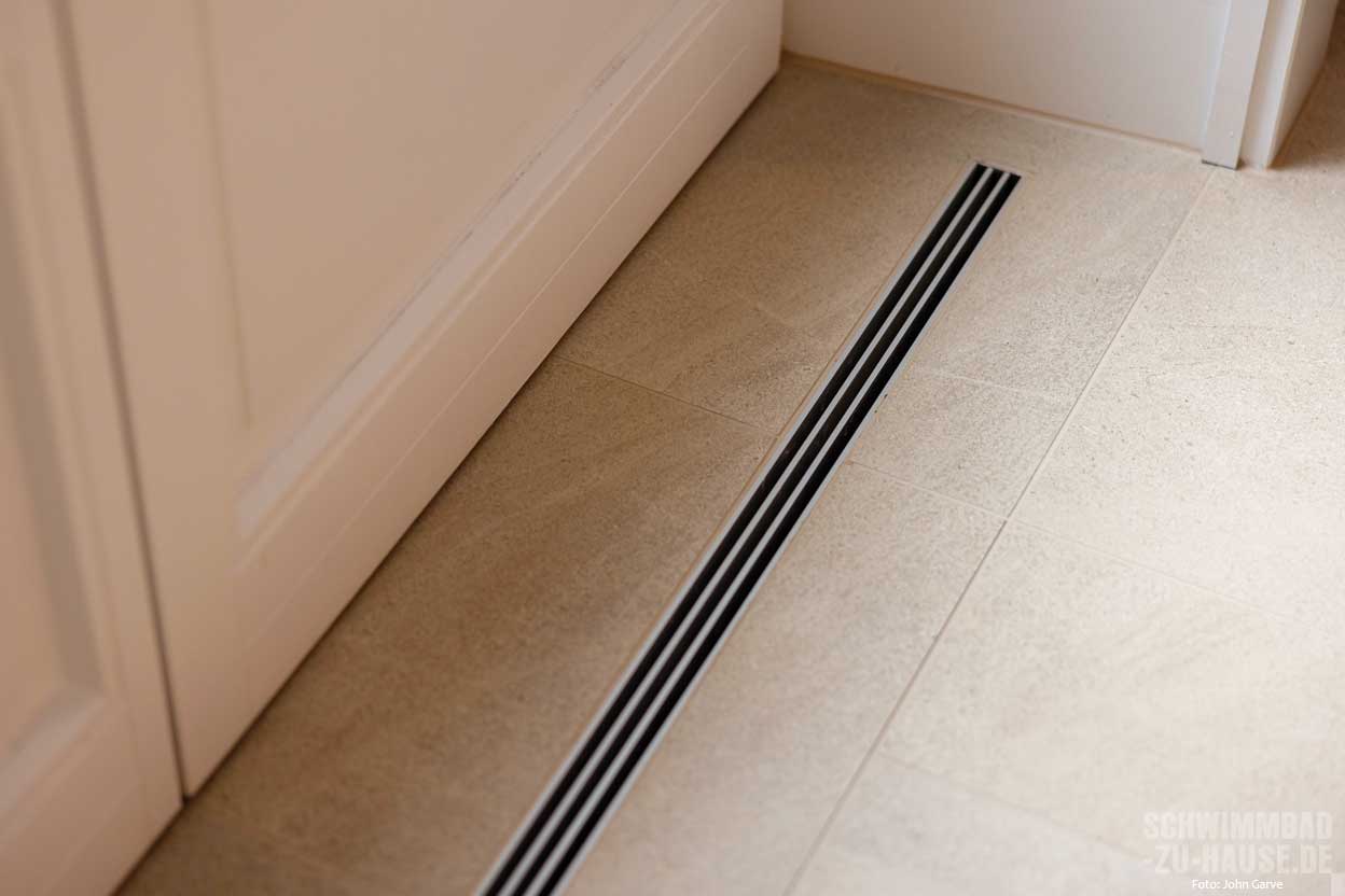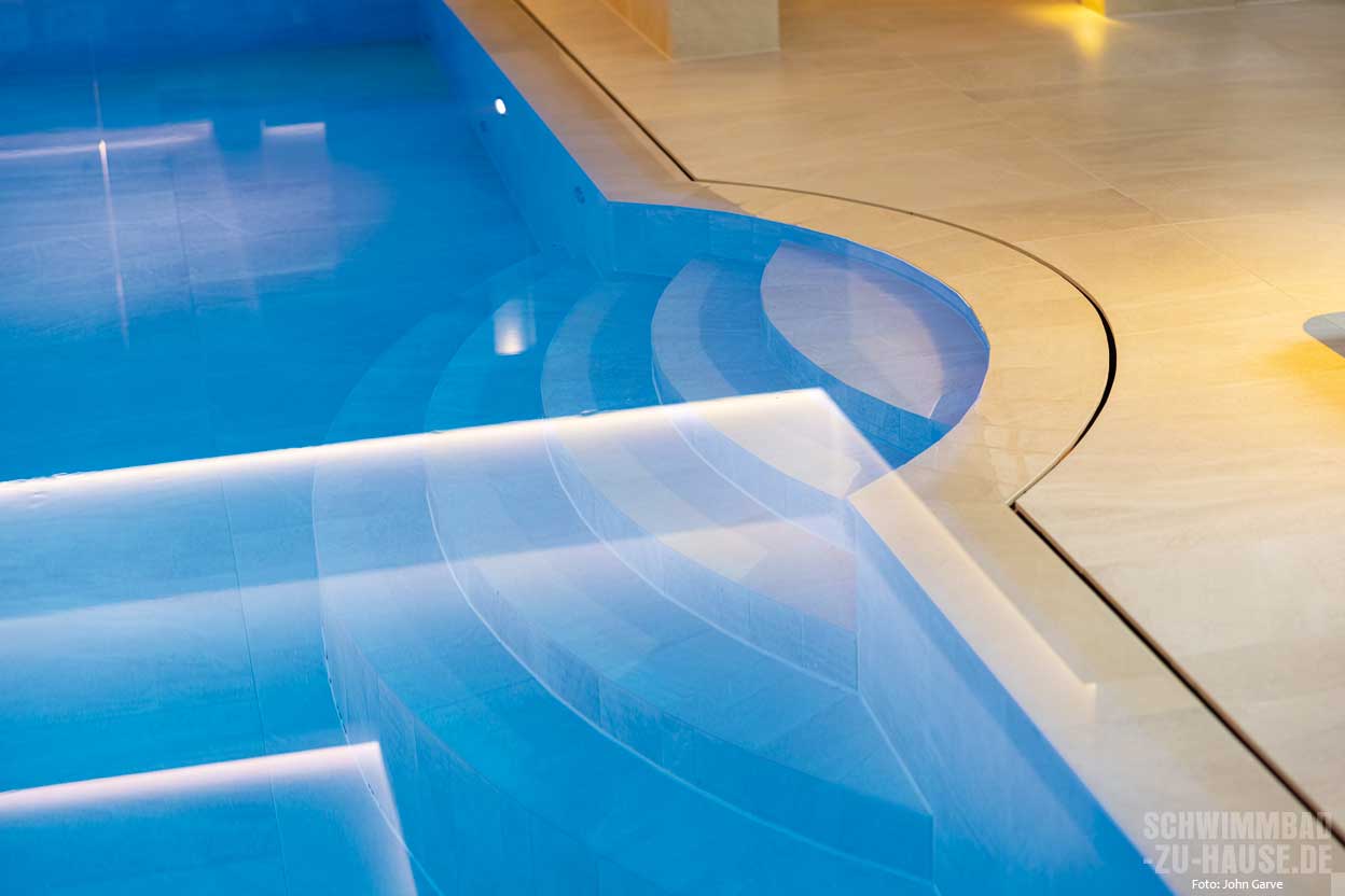 dominiert werden. Diese Elemente schaffen ein Gefühl von Weite und lassen viel natürliches Licht in den Raum. Passend dazu wurde das Schwimmbecken mit Steinfliesen in sanften Erdtönen ausgekleidet, die im Zusammenspiel mit dem Wasser an einen Sandstrand erinnern. Diese Fliesen stammen vom Fliesenhaus Mortensen in Hamburg und wurden von dem erfahrenen Fliesenleger Marc André Frahm aus Schleswig verlegt.