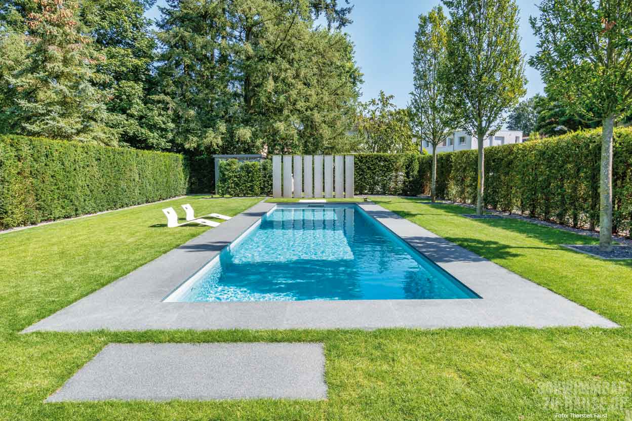 The cherry on top“ ist eine englische Redewendung, die ein Detail betitelt, das den krönenden Abschluss zu einer größeren Sache bildet. Das Schwimmbecken im Garten dieser Bauherren aus Hanau, hohe Tanne ist genau dies: das optische Sahnehäubchen der Kombination aus Grundstück, Garten und Wohnhaus. „Nach dem Hausbau waren meine Frau und ich uns beim Blick auf den Garten einig, dass hier ein Schwimmbecken hermusste“, berichtet der überaus designaffine Bauherr im exklusiven Gespräch mit haus+wellness*. Der Pool sollte sich nahtlos in die Architektur von Haus und Garten einfügen. Da es sich um ein längliches Grundstück handelt, sollte auch das Becken ähnliche Proportionen haben. Thorsten Staab, beauftragter Schwimmbadbauer von Pool-Konzept aus Haibach, nahm sich dieser Aufgabe an.