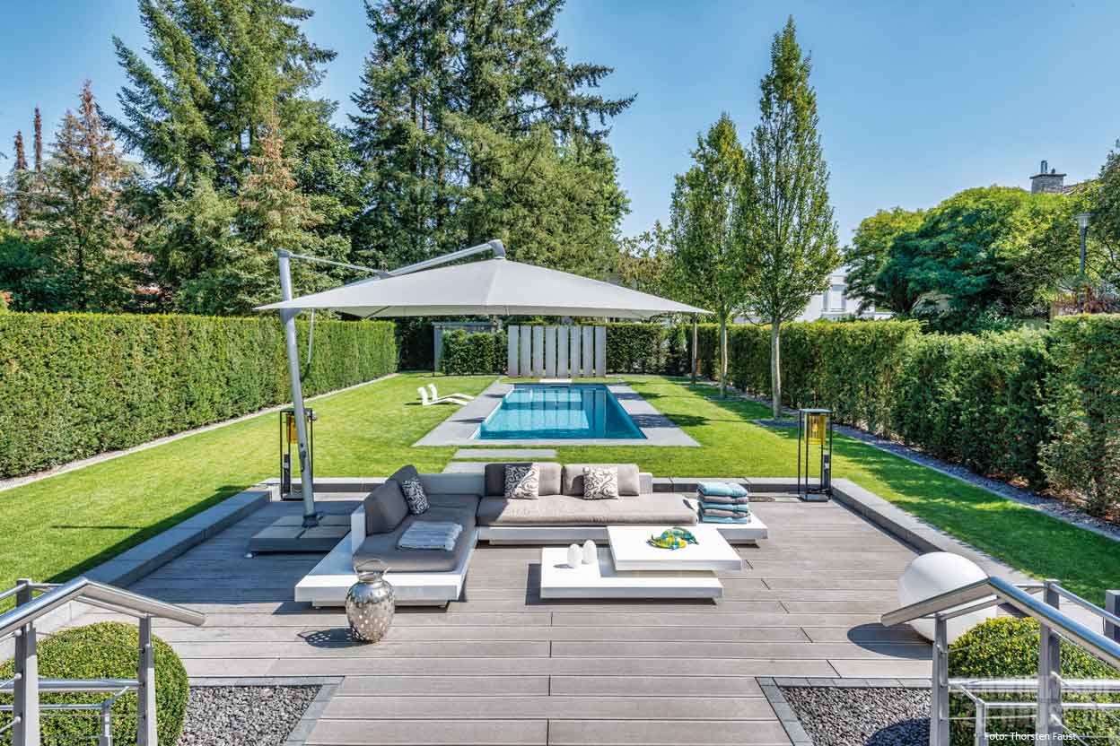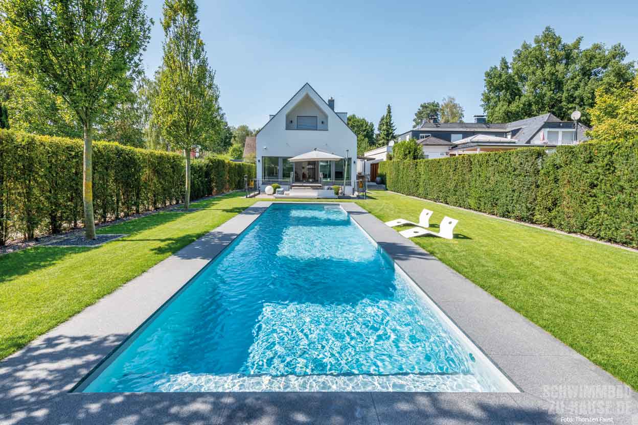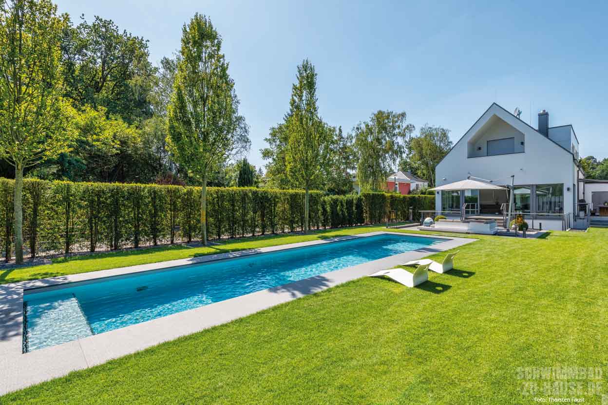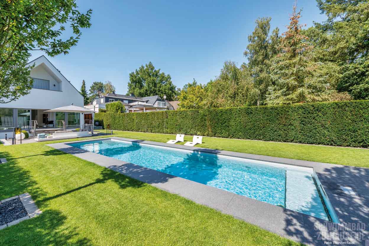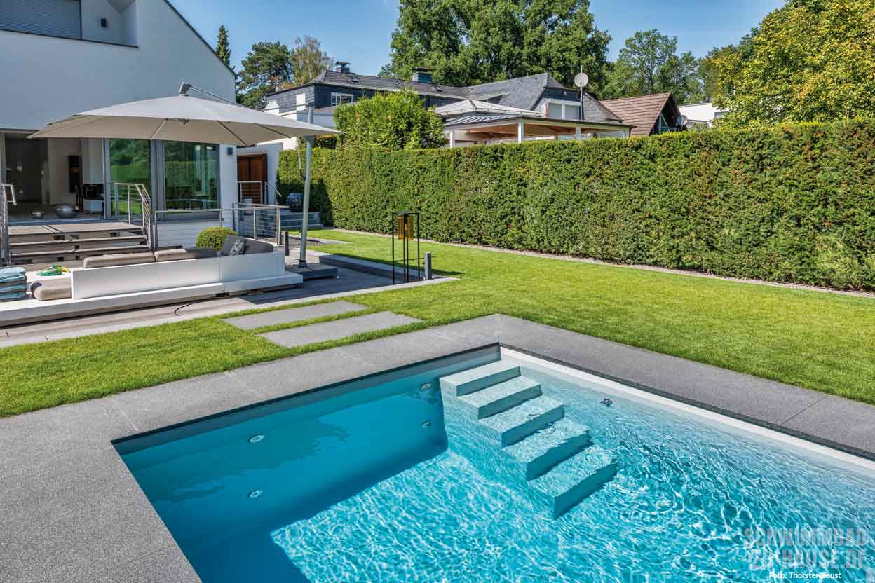 The cherry on top“ ist eine englische Redewendung, die ein Detail betitelt, das den krönenden Abschluss zu einer größeren Sache bildet. Das Schwimmbecken im Garten dieser Bauherren aus Hanau, hohe Tanne ist genau dies: das optische Sahnehäubchen der Kombination aus Grundstück, Garten und Wohnhaus. „Nach dem Hausbau waren meine Frau und ich uns beim Blick auf den Garten einig, dass hier ein Schwimmbecken hermusste“, berichtet der überaus designaffine Bauherr im exklusiven Gespräch mit haus+wellness*. Der Pool sollte sich nahtlos in die Architektur von Haus und Garten einfügen. Da es sich um ein längliches Grundstück handelt, sollte auch das Becken ähnliche Proportionen haben. Thorsten Staab, beauftragter Schwimmbadbauer von Pool-Konzept aus Haibach, nahm sich dieser Aufgabe an.