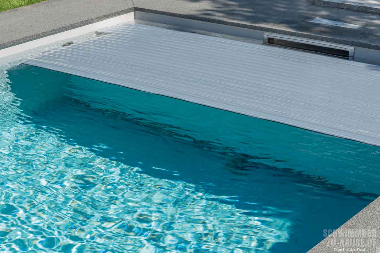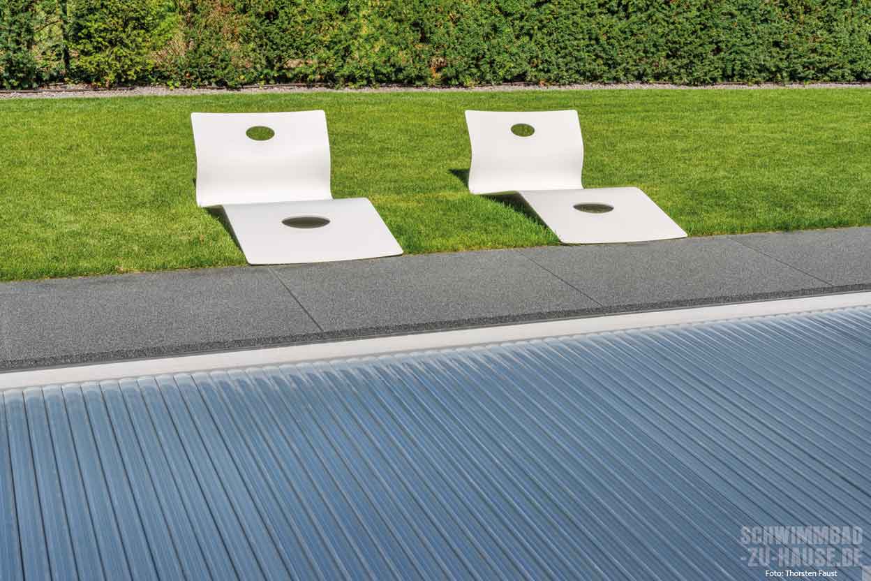 „Toll ist, dass der Pool uns kaum Arbeit macht“, schwärmt der Bauherr. Dank hochmoderner Schwimmbadtechnik läuft die Wasseraufbereitung vollautomatisch ab. Lediglich einmal in der Woche kontrolliert das Paar, ob Pflegemittel nachgefüllt werden müssen. Dank der verbauten Technik sparen sie nicht nur Zeit, sondern auch Energiekosten: Eine Unterflurrollladenabdeckung im Alu-Look mit Verkleidung, die übrigens als Sitzbank dient, hält die Wärme bei Nichtbenutzung im Pool und schützt vor Verschmutzungen des Badewassers. Ist das Becken abgedeckt, schaltet sich darüber hinaus zusätzlich eine spezielle Sparschaltung ein.