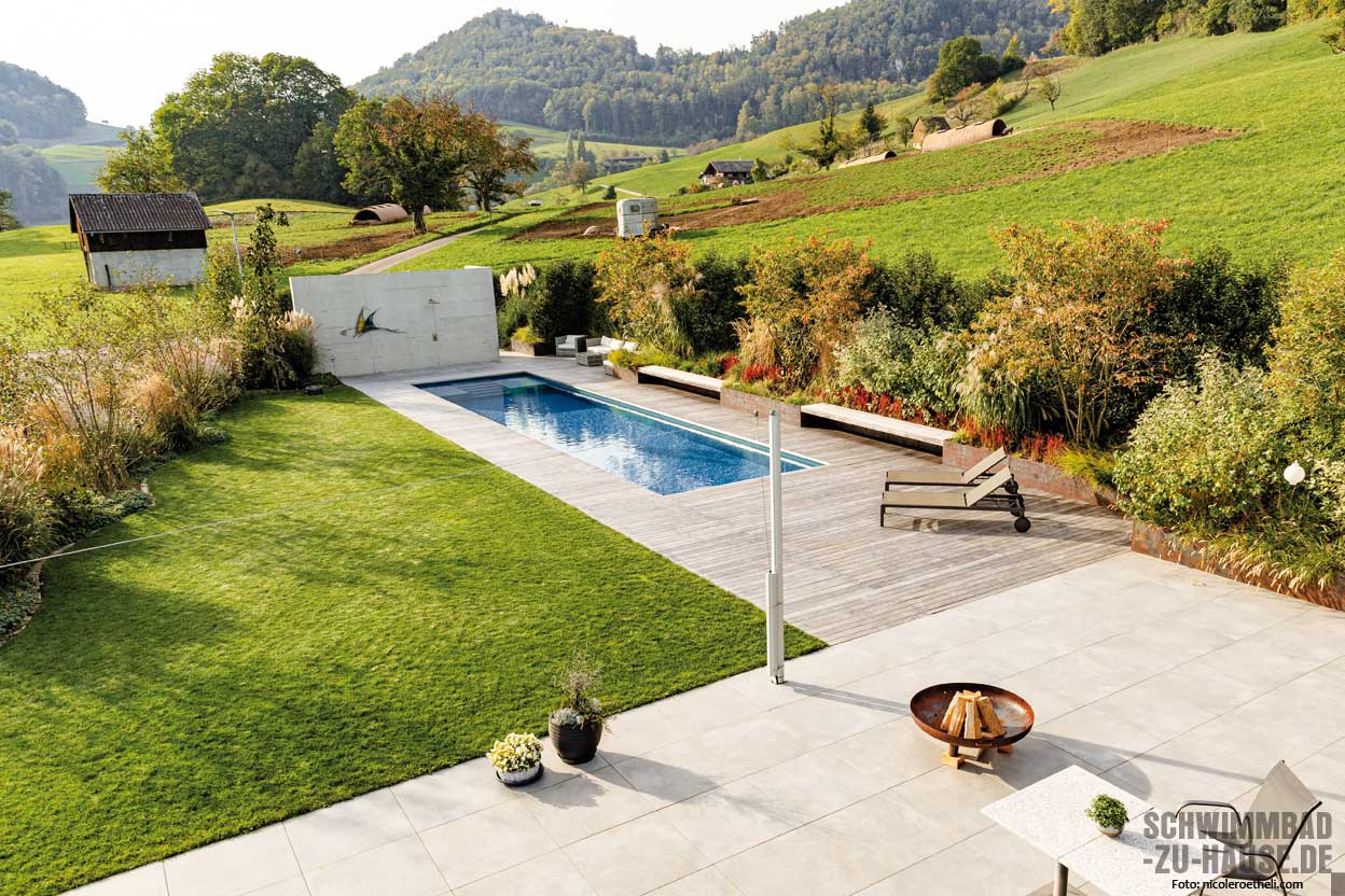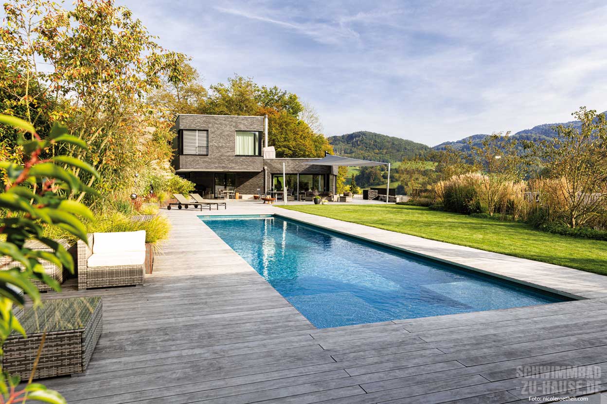 Auf dem langgezogenen von der Natur umrahmten Grundstück der Familie aus dem Baseler Land erstreckt sich der 15 Meter lange und 3,5 Meter breite Pool. Zuständig für die hervorragende Wasserqualität des Schwimmbeckens sind die Profis mit den Produkten der Firma Vivell Schwimmbadtechnik zuständig.