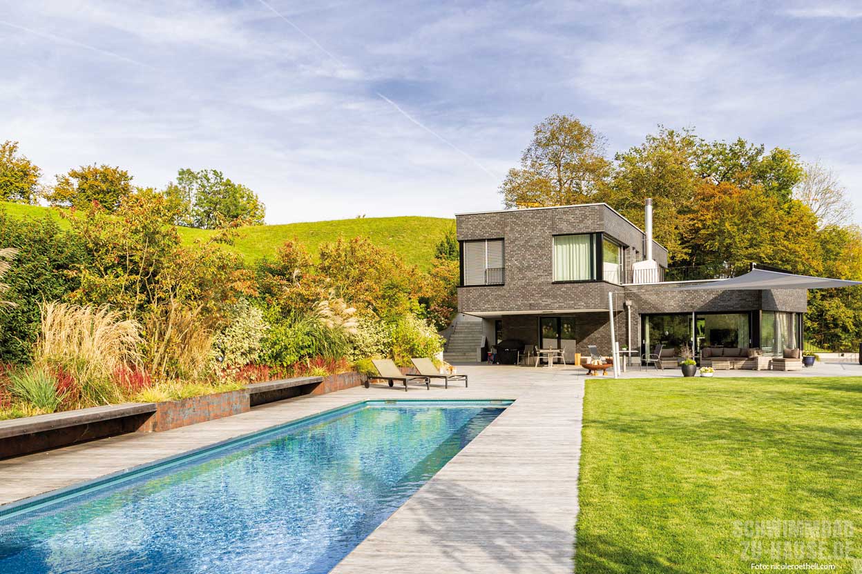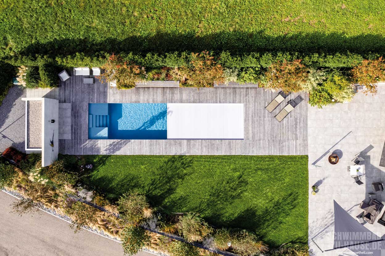 Mit dem an das trapezförmige Grundstück angepassten Einfamilienhaus öffnet sich vor dem Wohnbereich eine weite, von verschiedenen Sträuchern und Heckenpflanzen gesäumte Fläche. Der Architekt Antonio Stefanelli hatte bei der Planung die Idee, die Proportionen der Gartenanlage geschickt auszunutzen und sie unmittelbar an der Längsseite zu platzieren. So verblieb genug freie Fläche für den Bau eines umlaufenden Holzdielenbodens und eines kleinen Rasenabschnitts, obwohl das Becken mit den Maßen 15 x 3,5 x 1,5 stattliche Ausmaße annimmt.