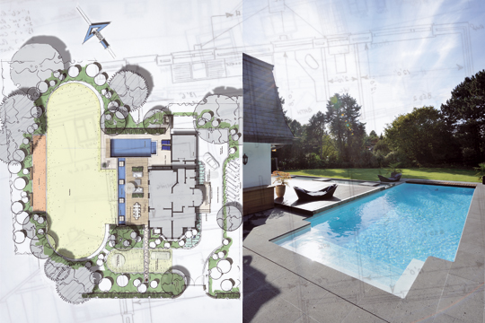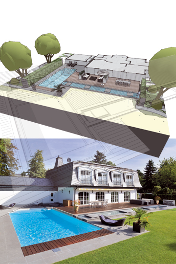 Mit der Entscheidung für die heimische Schwimmbad-Anlage steht für die Bauherr­schaft zunächst ein erstes Treffen mit dem Archi­tekten im Planungsbüro an. Im offenen Beratungsgespräch werden Ideen und Wün­sche zur Wellnessoase geäußert, Ma­terial- und Kostenfragen geklärt. „Die Vorgabe bei der Wellnessoase in Köln war eine vollständige Modernisierung der Gartenanlage in­klu­sive Schwimmbad“, so Architekt Jensen. Bereits realisierte Projekte werden im Beratungs­gespräch gerne als Inspira­tions­quelle herangezogen. Denn aus der Erfahrung weiß der Hamburger Garten­planer: „Die Vorstel­lungen von Bauherren sind oft sehr unterschiedlich. Viele wissen bis ins Detail, was sie wollen, andere gehen eher unbedarft an ihren Wohlfühltraum heran.“ Sollten Garten­bilder oder Baupläne existieren, lassen sich schon zu diesem Zeitpunkt genauere Ad-hoc-Lösungen in Form von Skizzen und Zeichnungen erarbeiten. Wirklich konkret wird die Entwurfs­planung allerdings erst mit der Ortsbesich­tigung. Eventuelle bauliche Hürden und Details werden exakt ge­prüft, um einen verbindlichen Entwurf zu er­stellen, der dann im nächsten Schritt als Grundlage für die Ausführungs­planung dient.