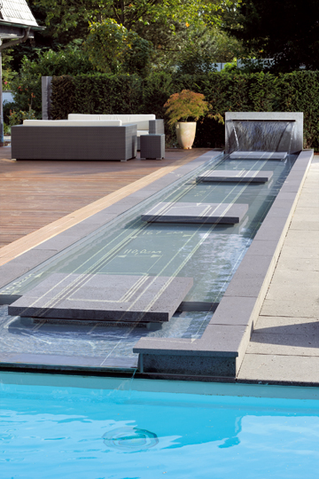 Die Bauphase ist die bedeutendste Etappe auf dem Weg zum fertigen Schwimmbad. Erst hier werden die Ideen und beauftragten Leistungen unter der Regie des Planungs­büros umgesetzt. Jedes Detail, jeder Gärtner und Steinsetzer, Schwimmbad­-Bauer oder Pflanzenlieferant muss nun vom Garten­planer als übergeordnete Bauleitung koordiniert werden. „Die Besonderheit bei der Wellness­anlage in Köln“, so Jensen, „war der gesamte Gedanke einer kompletten Er­neuerung des Outdoor-Be­reichs. Das Vor­gänger-Schwimmbad, ein sehr wuchtiges Becken aus den Siebzigern, wurde durch ein modernes Modell der „D-Line“ von Riviera ersetzt und mit einer großzügigen Terrasse verbunden. An diese schmiegt sich ein Bachlauf, der den Wohnbereich optisch vom Garten trennt. Über Trittsteine besteht dabei jedoch weiterhin die Möglichkeit, sich zwischen Haus und Garten hin- und herzubewegen.“ Die Bauphase schließt letztlich mit der Abnahme durch die Bauleitung ab. Bei einem großen Projekt ist es sehr wichtig, Details nicht aus den Augen zu verlieren. Der Hamburger Architekt spricht aus Erfahrung: „Nur in der Einheit von Haus und Garten entsteht eine wahre Wohlfühloase. Dabei kommt es vor allem auf den stimmigen Gesamteindruck an. Die richtige Bepflan­­zung eines Gartens ist zum Beispiel wesentlich für den Charakter einer Außen­anlage.“ Und diese Handschrift spürt man auch in Köln. Die Wellnessanlage wurde nicht nur nach den Wünschen der Bau­herr­schaft sehr modern gestaltet, sie lebt vor allem auch von ihrem harmonischen Gesamt­eindruck.