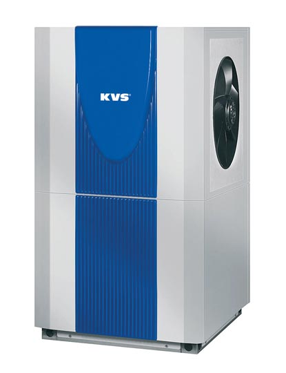 „Poll-Tech Innen“ von KVS. Schalloptimierte Wärmepumpe für den Inneneinsatz. Energieeffiziente Abtauung durch Kreislaufumkehr und schräg liegendem Verdampfer. Rücklauffühler und Sanftanlasser integriert, Außenfühler beiliegend.
