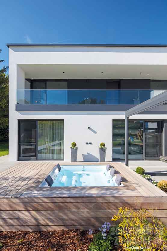 Nur wenige Schritte vom Haus entfernt, quasi als Bindeglied zwischen Gebäude und Schwimmbad, wurde der neue Whirlpool platziert. Im „Strato 2.3“ genießt die Familie entspannende Massagen für die kostbare Auszeit vom Alltag. Da die Hausherren ihre Zeit lieber im Wasser als mit dessen Pflege verbringen wollten, haben sie sich für das komplette Pool-Manager-System von Bayrol entschieden. „Im Prinzip müssen wir nur alle paar Wochen mal den Chlorkanister wechseln oder hier und da das Sieb am Skimmer kontrollieren“, erzählt der Hausherr im Gespräch mit haus und wellness*. Monatlicher Zeitaufwand? „Vielleicht fünf Minuten!“ So bleibt trotz Familie und Beruf noch genügend Zeit für ausgiebigen Urlaub zu Hause.