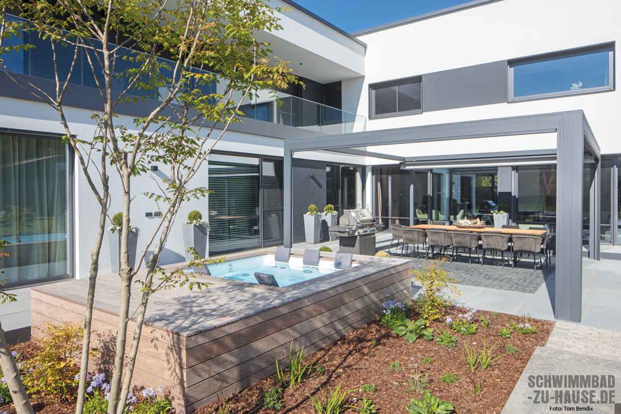 Der großzügige Garten im Landkreis Neumarkt bietet alle Möglichkeiten, um das Leben im Freien zu genießen. Nach umfassender Recherche, Beratung und Planung – neben dem Poolbauer war unter anderem auch ein Landschaftsarchitekt beteiligt – macht nun ein Badeparadies mit stattlichem Schwimmbad und Whirlpool das Urlaubsfeeling im eigenen Garten hinter dem Haus komplett.
