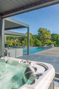 Durch den „Integra“-Rollladenschacht, der als im Becken integrierte Unterwasser-Sitzbank dient, beträgt die gesamte Wasserfläche etwas über 10 Meter. Darin verbirgt sich ein Solarrollladen, der zusammen mit einer Wärmepumpe, einer Photovoltaikanlage und der Thermaton-Hinterfüllung die Energiekosten senkt.